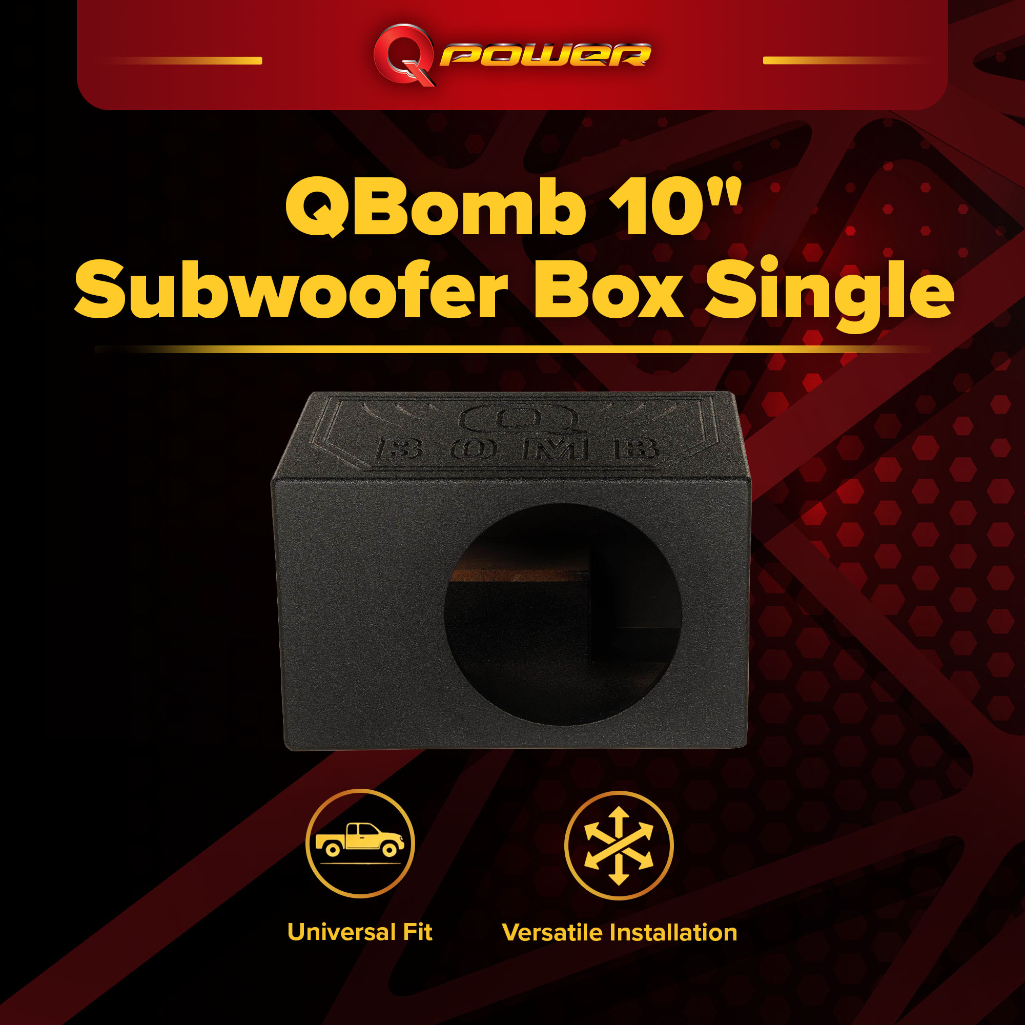 The Q-Power 10" Q-Bomb subwoofer box is finished with a black bedliner spray for increased durability. Turn your ride into a sound machine with the help of the Q-Power 10" Subwoofer Enclosure! If you want the most output for your money, this is the way to go.