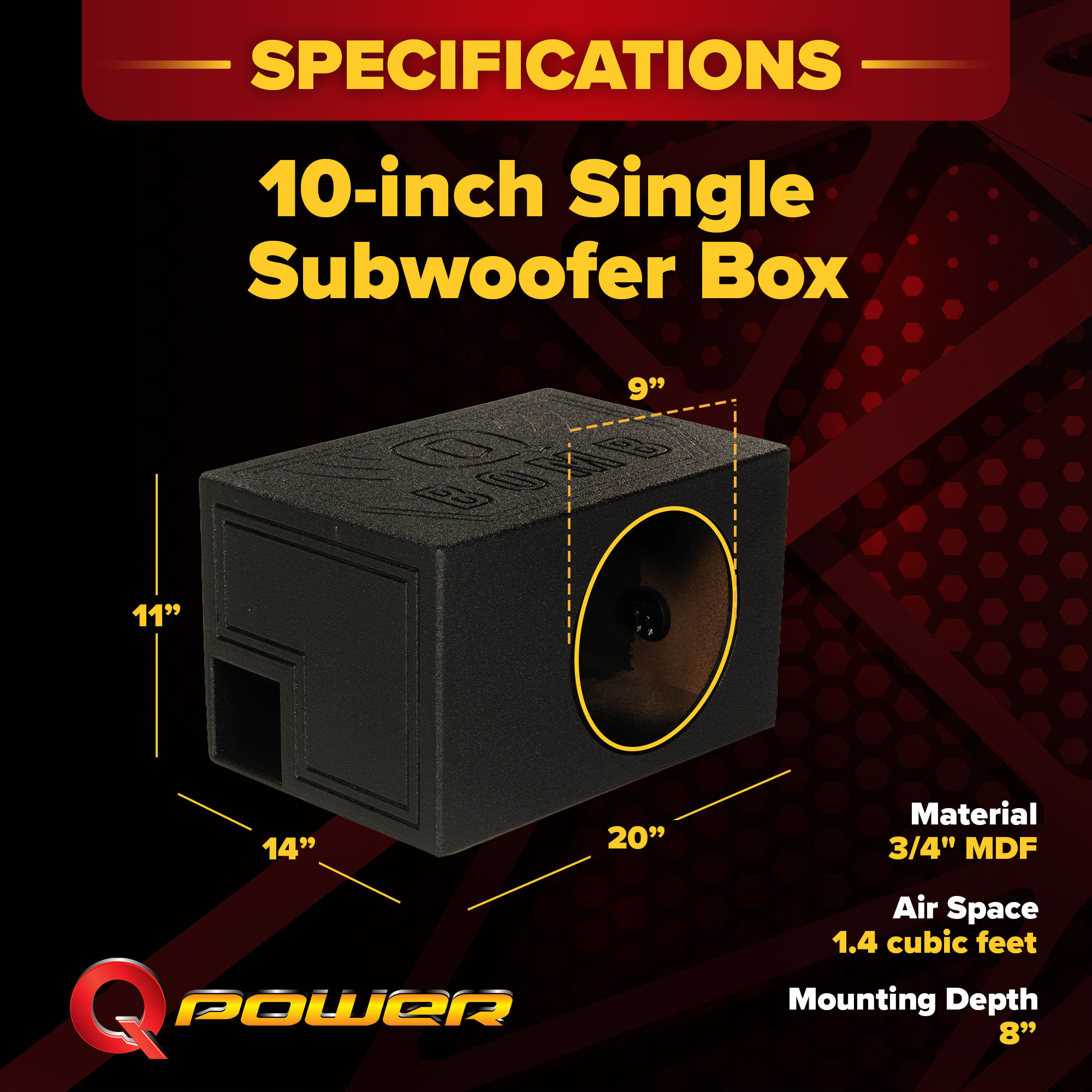 This Q-Power 10" QBOMB10VL Single Vented Subwoofer Box Enclosure is designed and built for the deepest bass. It features a single vented chamber design and boasts 1.4 cubic feet of air space.