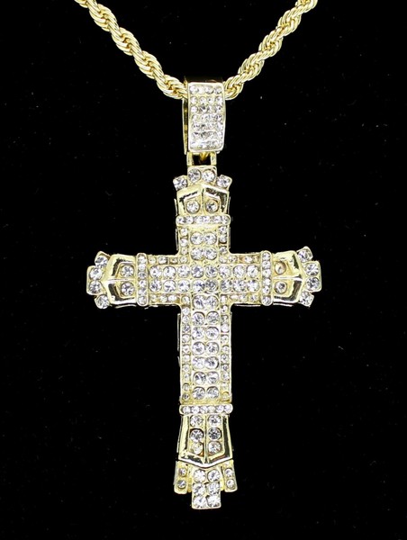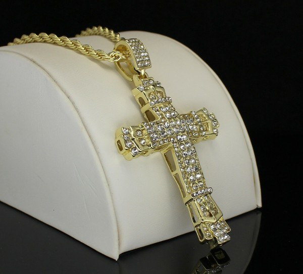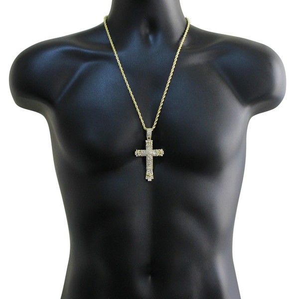 Icy Pendant Cross Cz 14k Gold Plated Bling Solid Rope Chain Men's Jesus