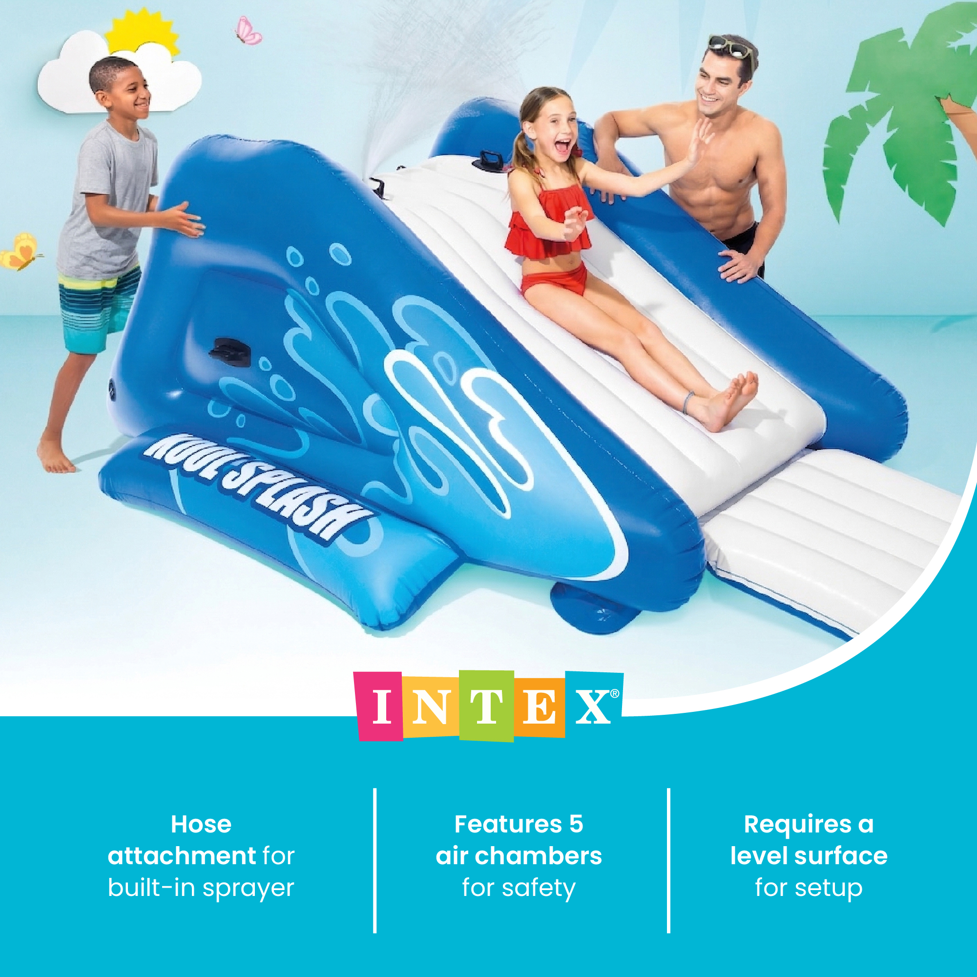 Beat the summer heat and introduce a new way to make a splash with the Intex Kool Splash Water Slide. Built for kids aged 6 years and older, this backyard pool accessory will help to give friends and family a memorable Summer experience.