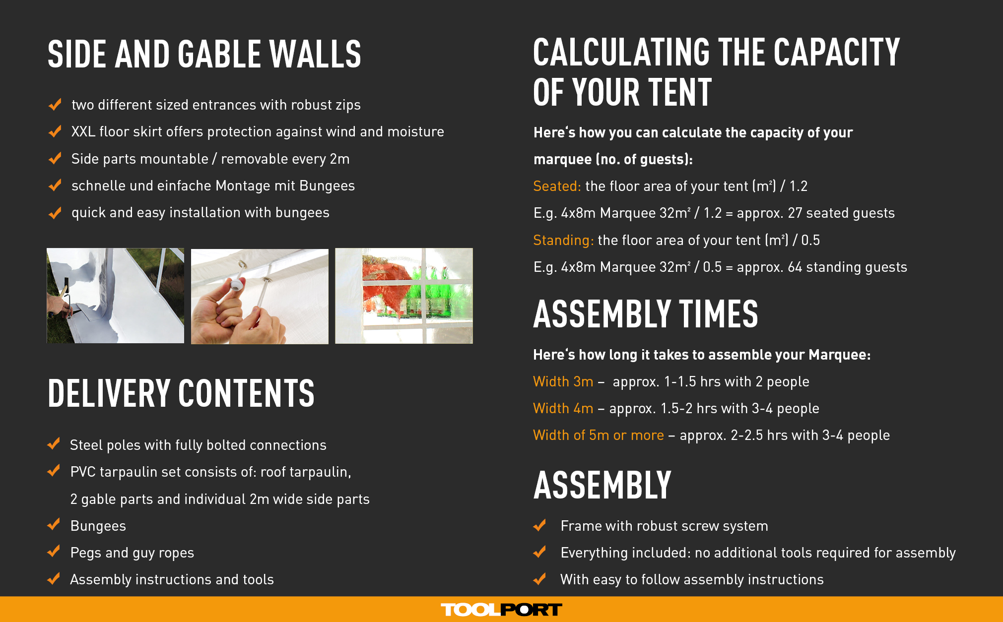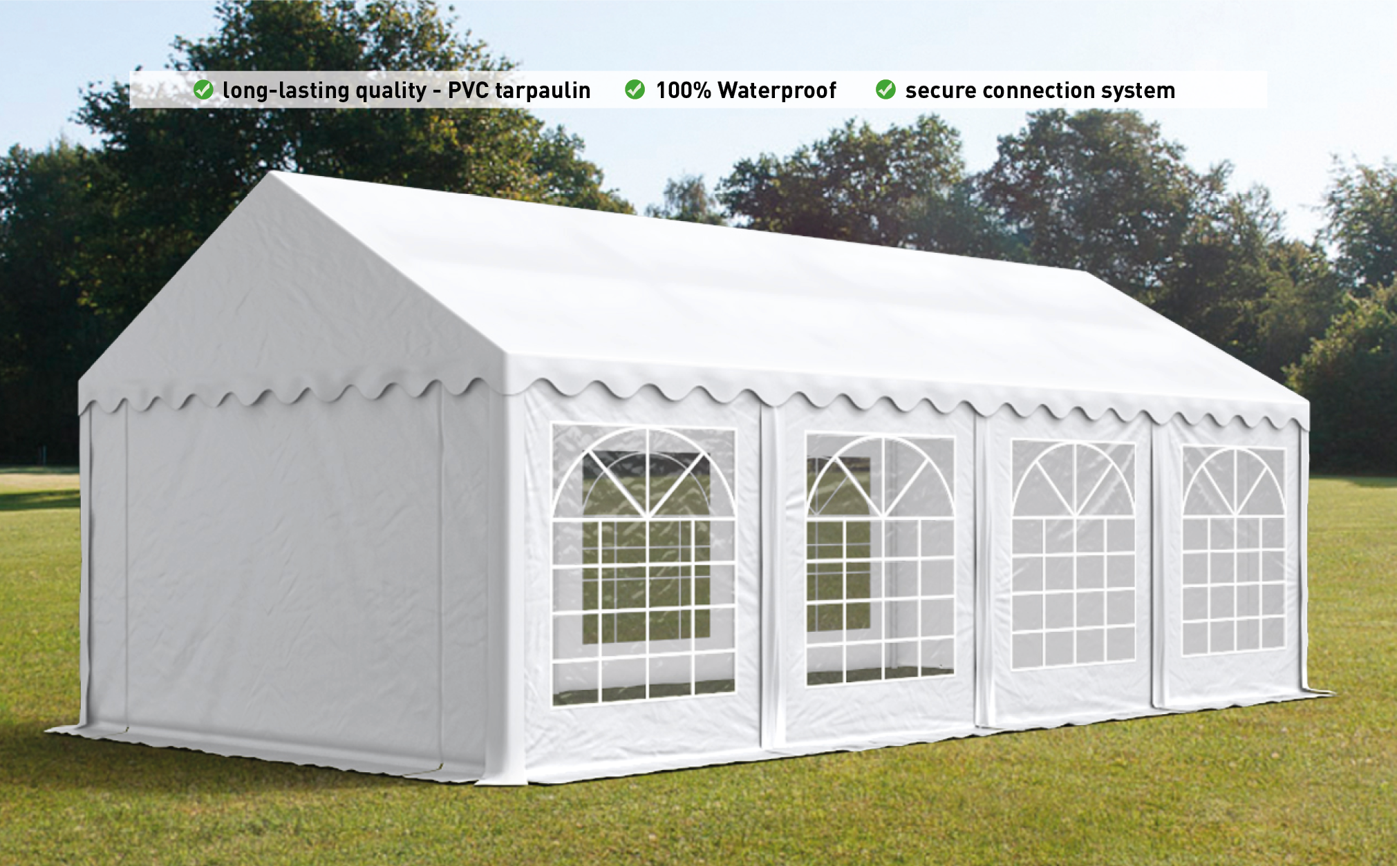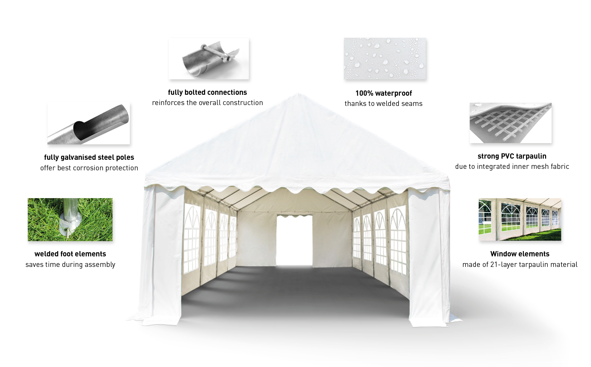 This marquee features an easy-to-install frame made of fully galvanised, anti-corrosive steel and strong, PVC 700 N tarpaulins with a heavy-duty patterned internal fabric.