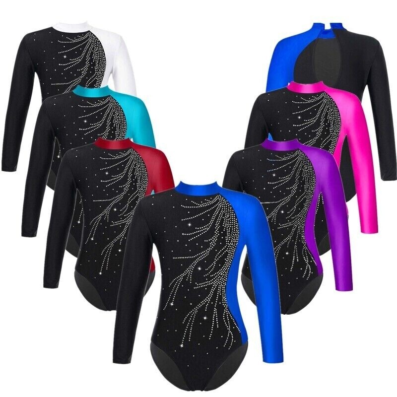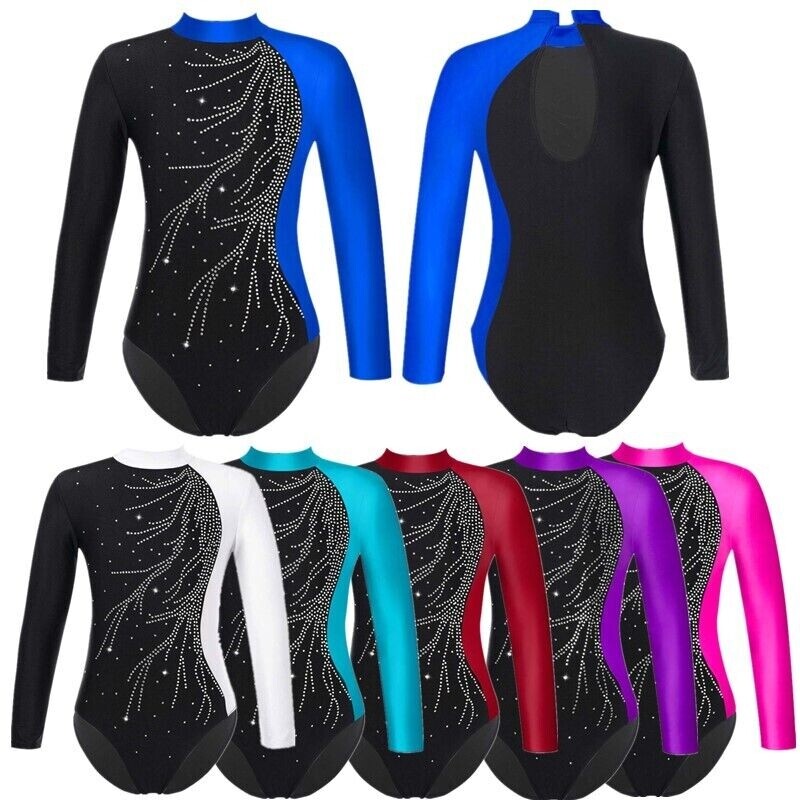 Tanztrikot für Mädchen mit Stehkragen und langen Ärmeln, glänzenden Kunstdiamanten und Schlüsselloch-Rücken.