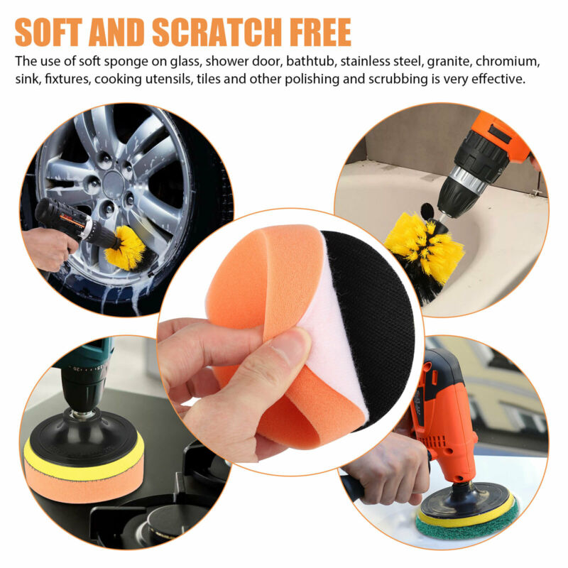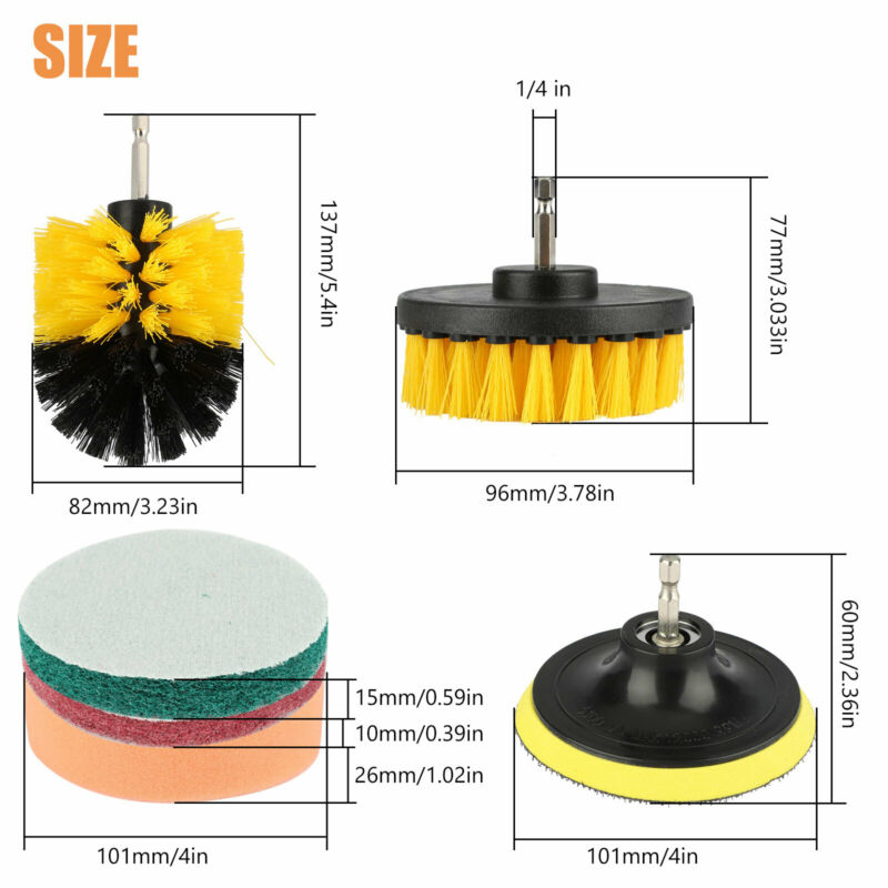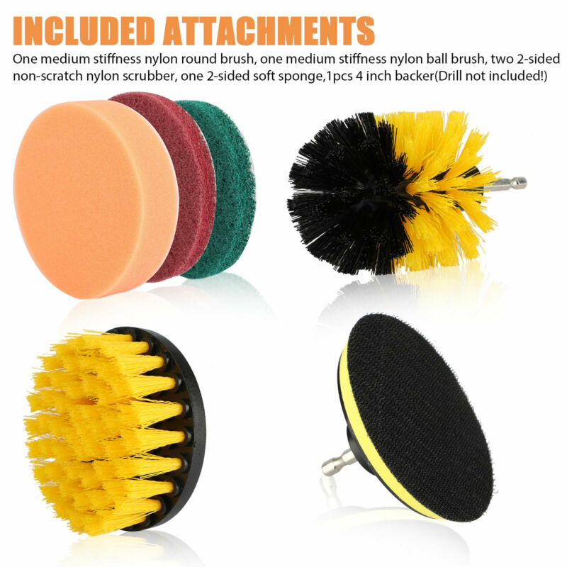 馃挐Included Attachments: One medium stiffness nylon round brush, one medium stiffness nylon ball brush, two 2-sided non-scratch nylon scrubber, one 2-sided soft sponge,1pcs 4 inch backer(Drill not included!)