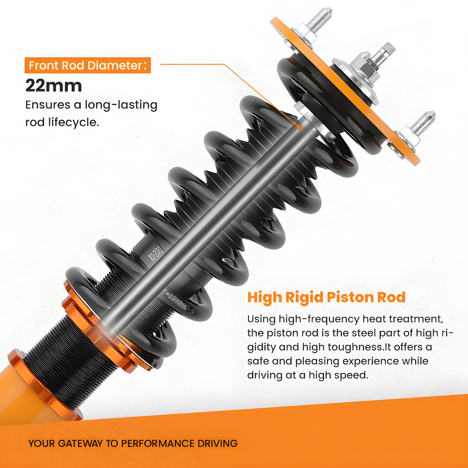 2.24 levels of adjustable damper -- This allows you the ability to perfectly dial in your coil-overs system. For nice comfortable driving, set damping to full soft. For more spirited driving, set it to 16 clicks. For occasional track days, set it to full stiff.