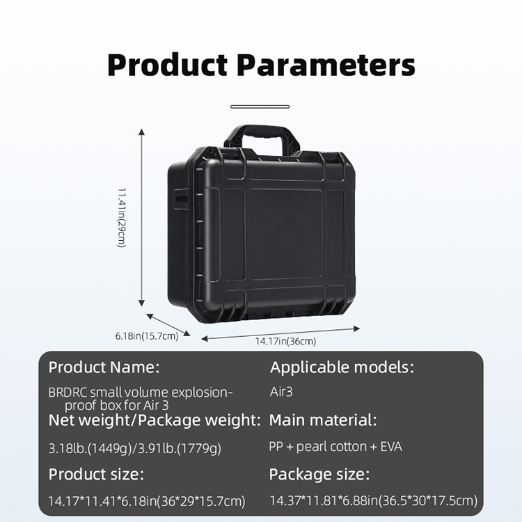 Features: PP outer shell, splash-proof, drop-resistant, sturdy and durable Internal pearl cotton material production, precise fit the body and accessories, soft and comfortable, to prevent damage to the machine Effectively mitigate the impact of external forces, to give effective protection of the machine body Gas balance valve, balance the box internal air pressure, to avoid high altitude or temperature caused by the inability to open the box or bouncing box phenomenon Large-capacity for storage, can store the drone, storage protective cover, remote control, batteries, joysticks, battery management, chargers, propellers and other accessories Specification: Material: PP (Shell) + Pearl Cotton (Inner Tank) + EVA Color: Black Size: 36x29x15.7cm Applicable Model: for DJI Air 3 Quantity: 1 PCS Package: 1x Storage Bag Note: The RC-N2 remote control and the RC 2 remote control with screen cannot be placed in the case at the same time. Does not include the drone, remote control, battery, battery manager, charger and all accessories in the bag. Transition: 1cm=10mm=0.39inch Since the size and weight are manually measured, due to different measurement methods, there may be certain errors in the weight and size of the product, but the error does not affect the normal use of the product, please confirm that you know and accept the error before purchasing. Due to the difference between different monitors, the picture may not reflect the actual color of the item, please make sure you do not mind before ordering, thank you.