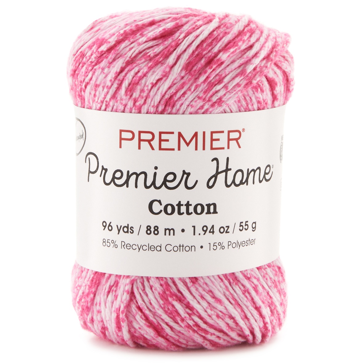PREMIER YARN-Home Cotton Yarn-Multi. This medium weight cotton blended with polyester means colors stay brighter longer, finished projects dry faster and projects are more durable to last longer! Perfect for mesh wash cloths and more! Weight Category: 4. Content: 85% cotton, 15% polyester. Putup: 2.1oz/60g, 105yd/96m. Gauge: 18stx24r = 4in/10cm on size US8/5mm knitting needles. Suggested crochet hook size US1-9/5.5mm. Dyelotted: we try but are not always able to match dyelots. Care: machine wash, dryer safe, do not bleach, do not iron, do not dry clean. Comes in a variety of colors. Imported.