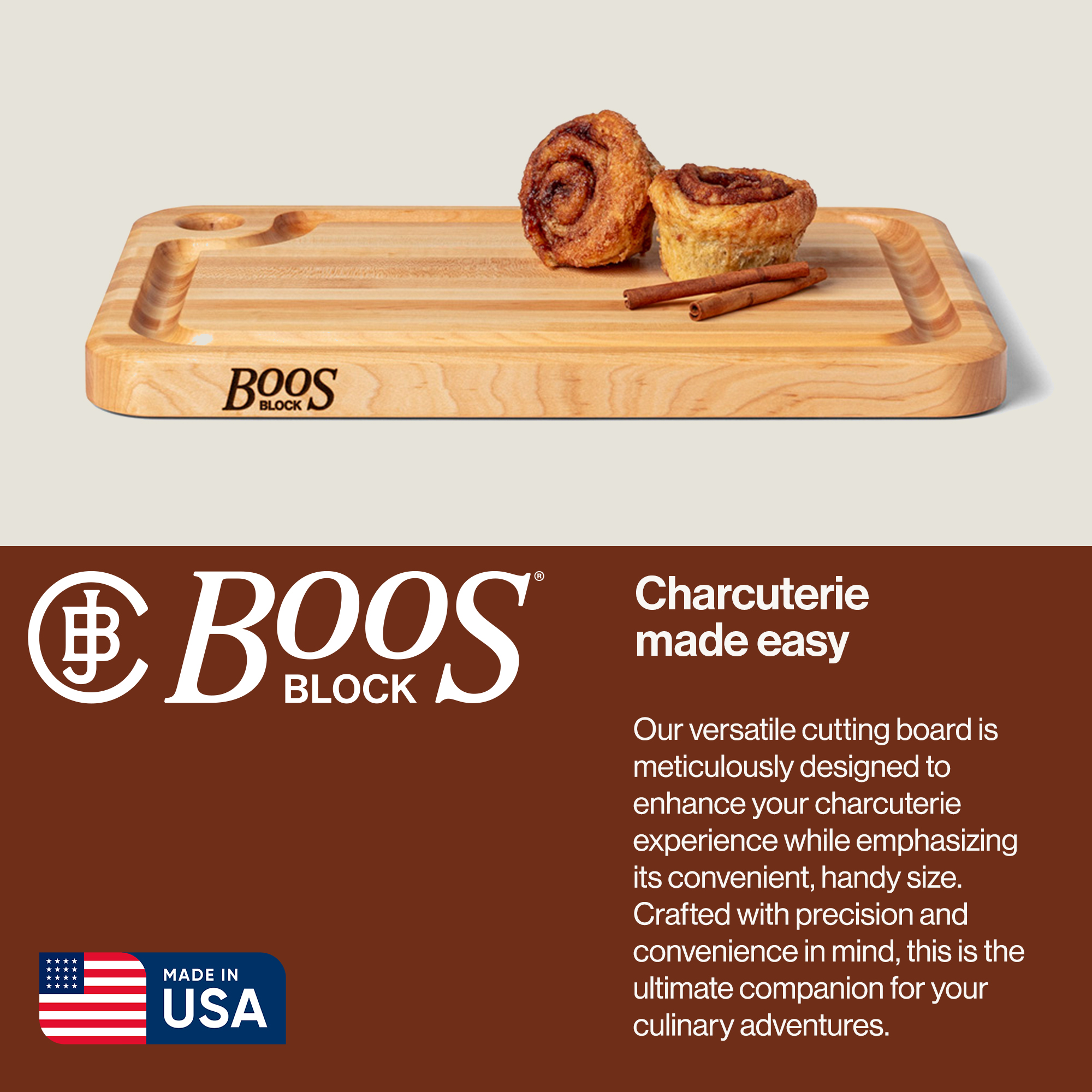 Made in our home and crafted for yours, the Prestige series John Boos wood cutting board is a timeless addition to your kitchen arsenal. Crafted with precision, this large cutting board provides ample space for chopping meats, fruits, and veggies. Made from solid wood with an edge-grain design, it ensures durability and elegance in food preparation and presentation. This reversible chopping board combines juice grooves with a flat construction, making it suitable for various culinary tasks.