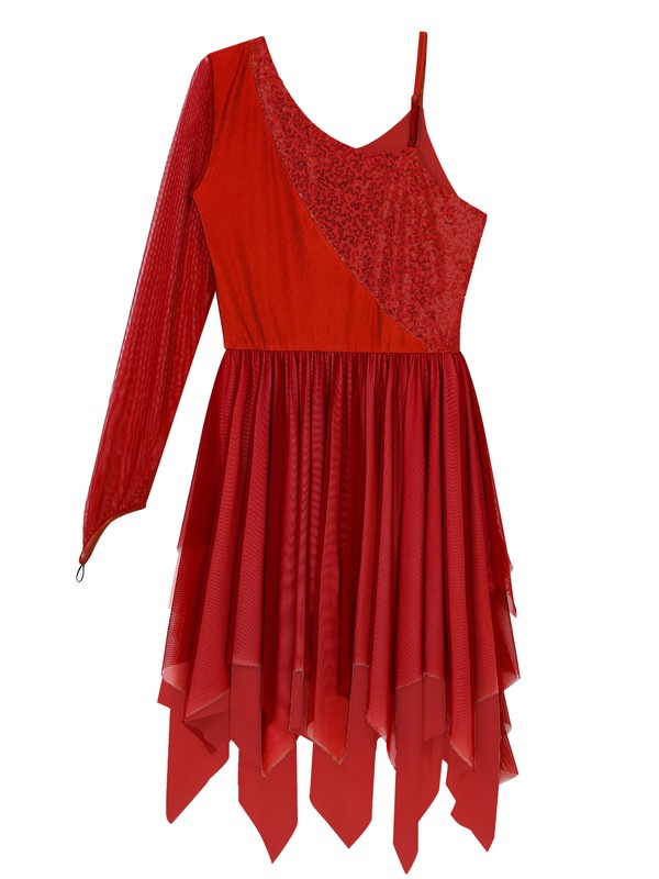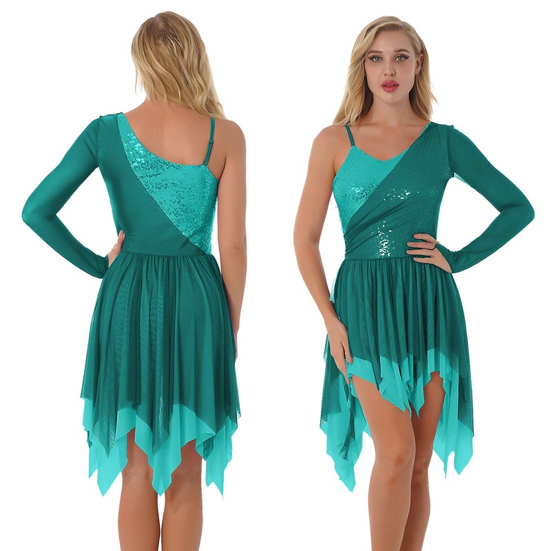 Tanzkleidung mit funkelnden Pailletten für Damen One Schulterumfang Langarm-Tanzkleid aus durchsichtigem Mesh.