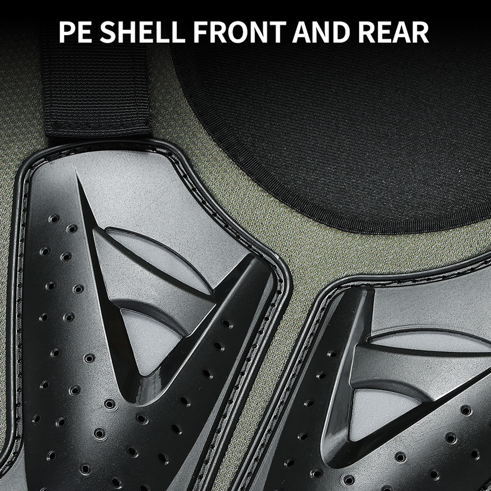 PE shell protection on shoulders, front chest and back, multiple small holes in the shell with built-in reflective fabric