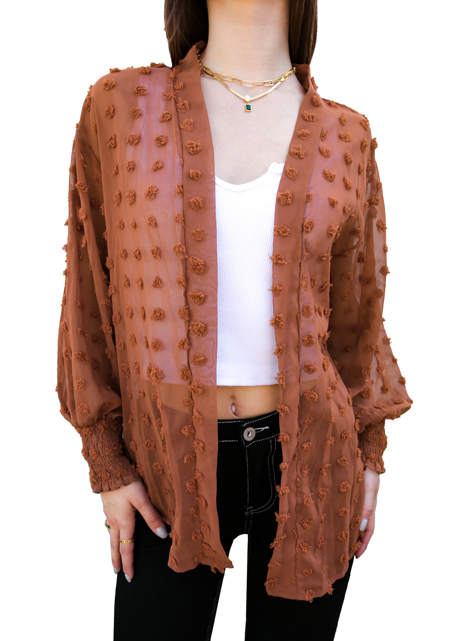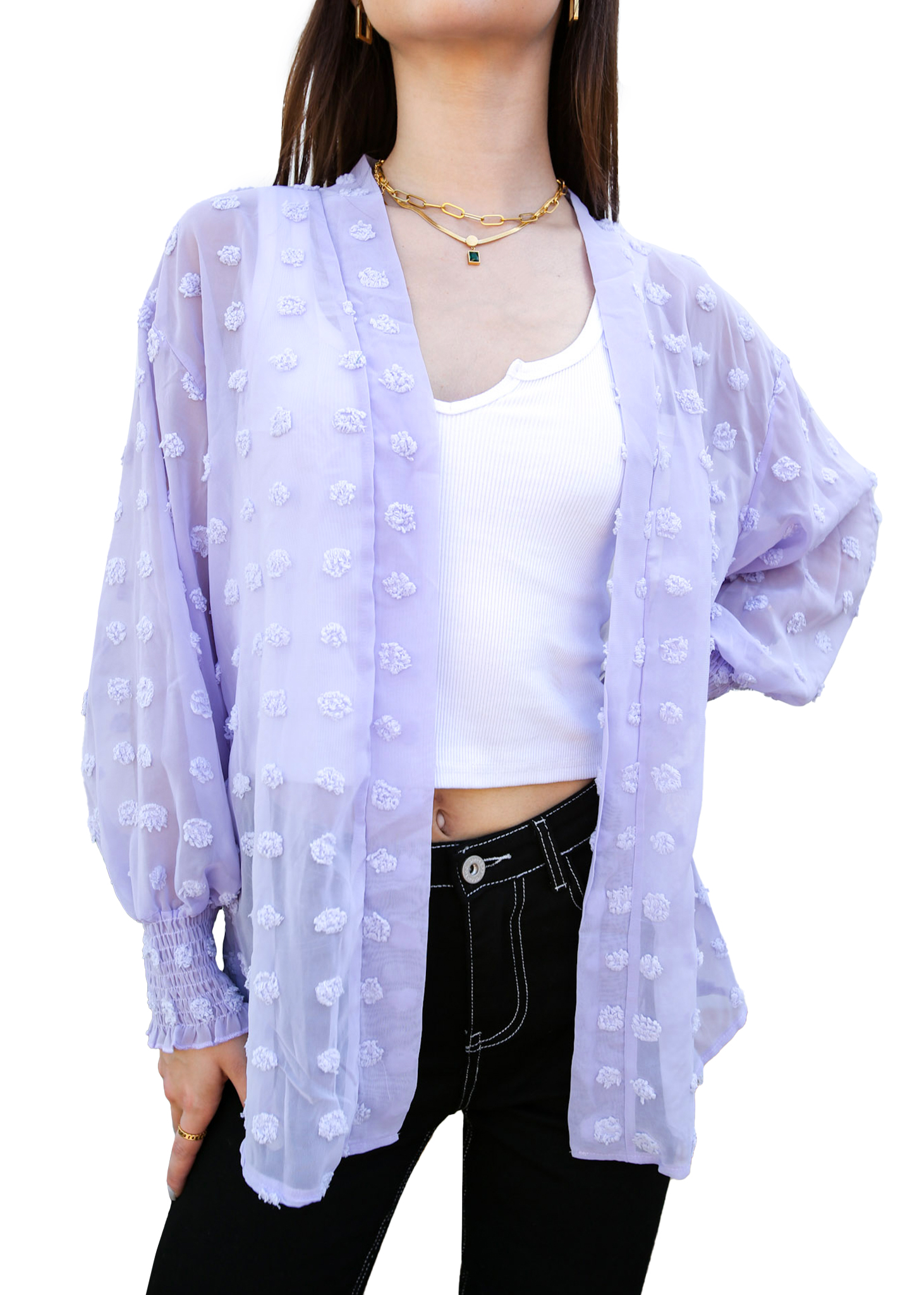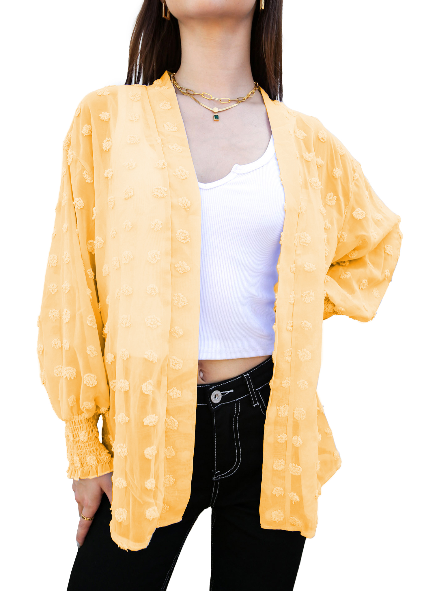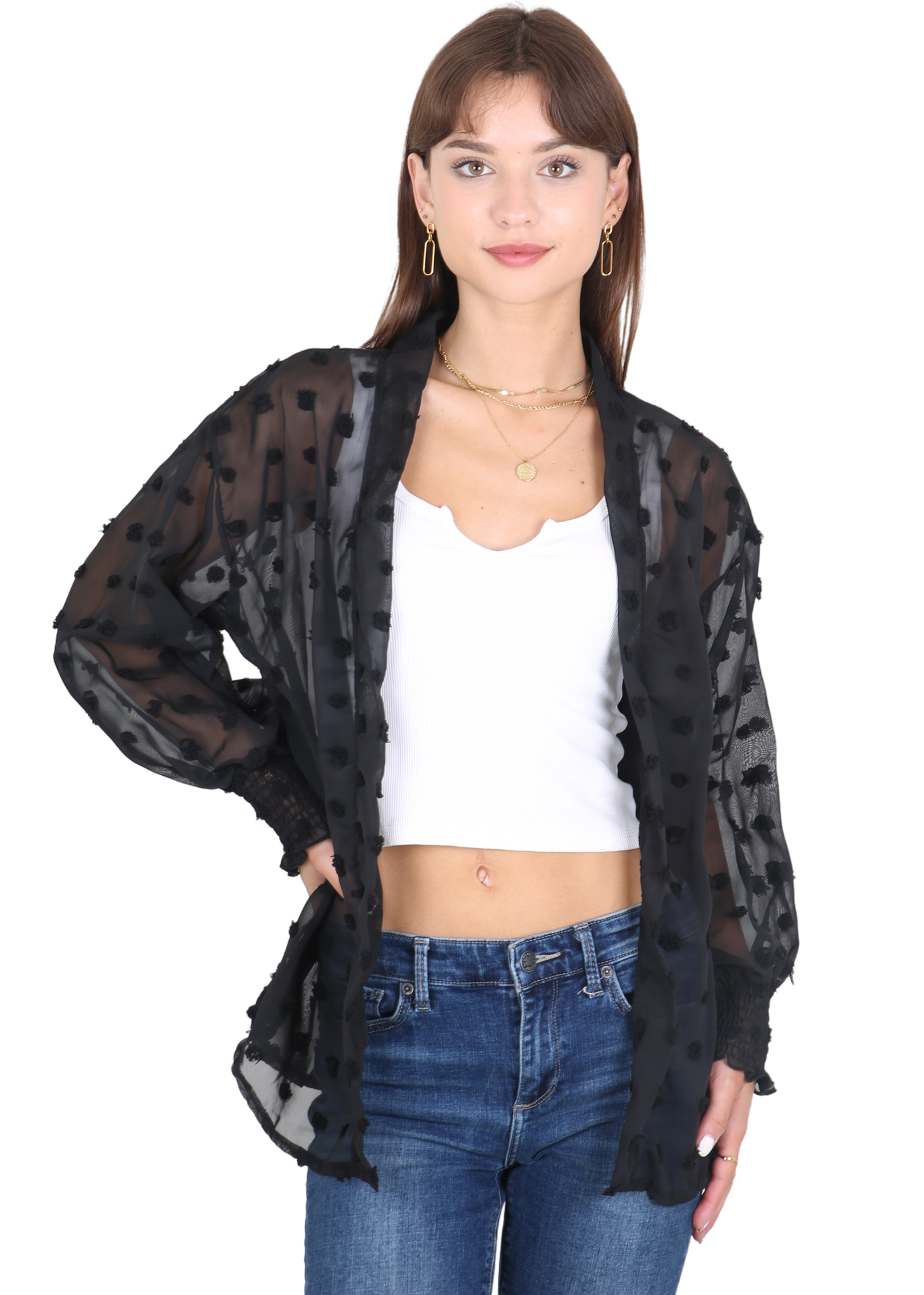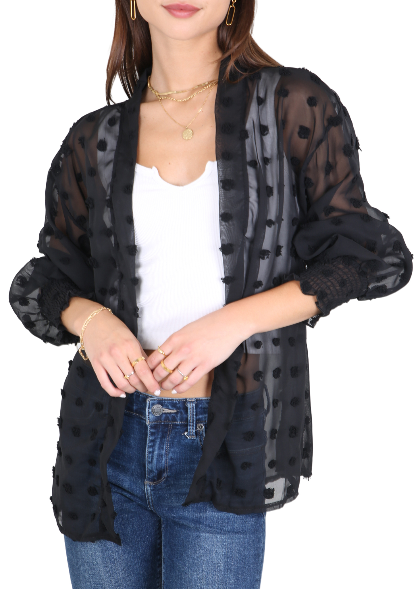 The kimono jacket is detailed with a beautiful clip dot material. Features an open front, bishop sleeves, regular fit, and semi-long length. Layer it over a basic tank and jeans to elevate your look.