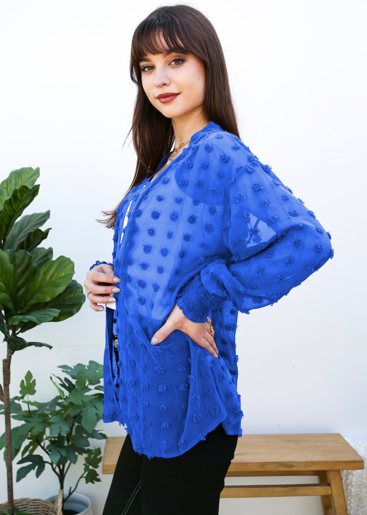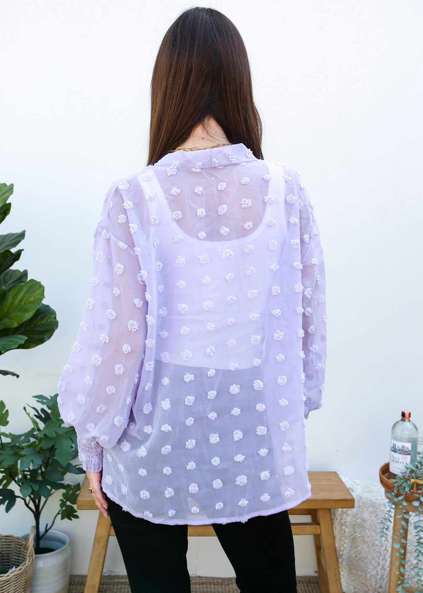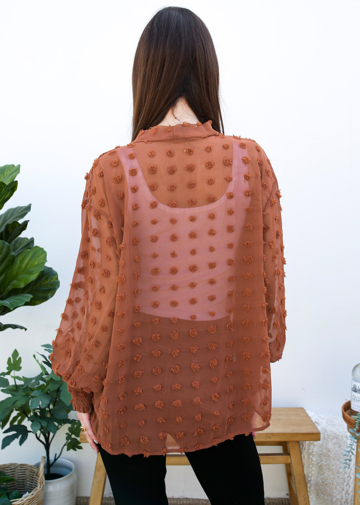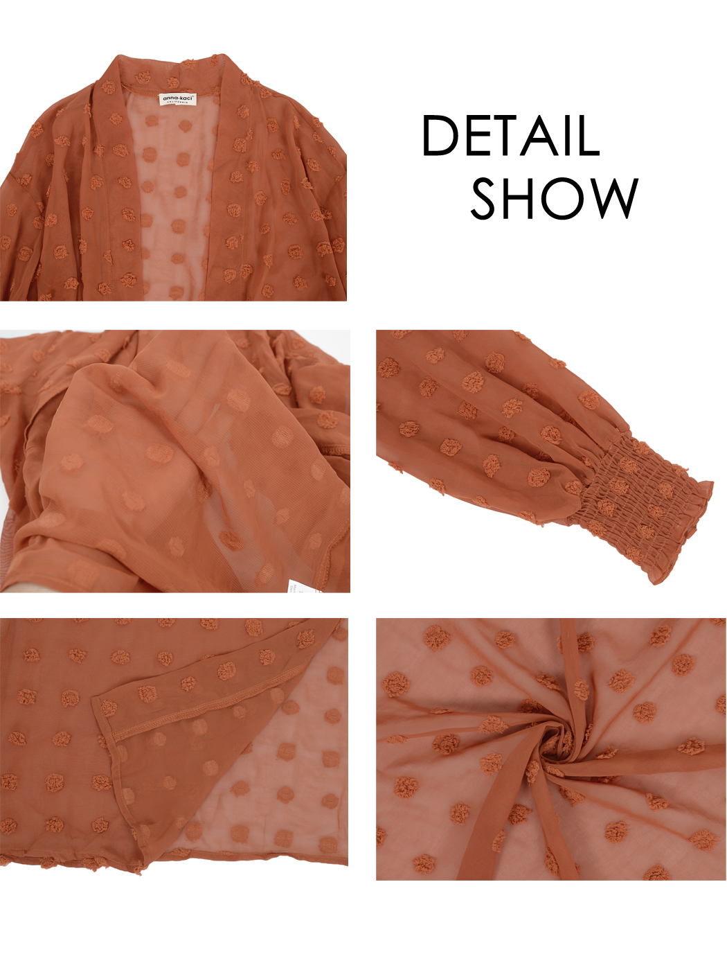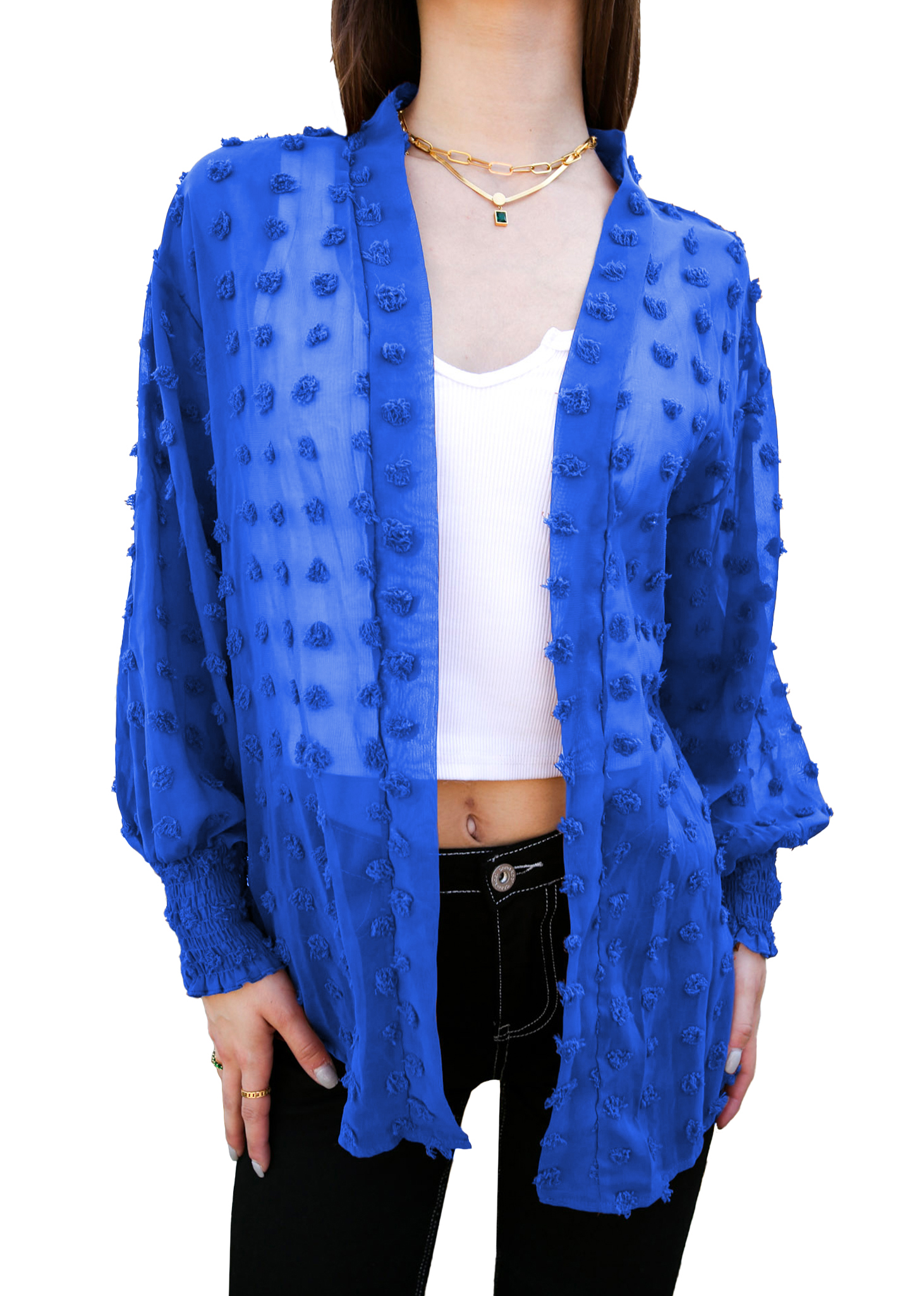 The kimono jacket is detailed with a beautiful clip dot material. Features an open front, bishop sleeves, regular fit, and semi-long length. Layer it over a basic tank and jeans to elevate your look.