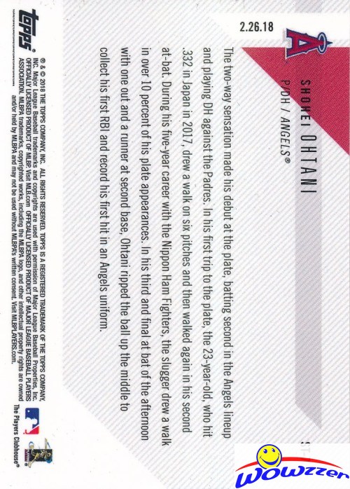 Wowzzer! In Stock! Check out this Amazing Limited Edition Special TOPPS ROOKIE Card of Japan's Babe Ruth! We are Very Proud to offer this 2018 Topps Now #ST-7 SHOHEI OTHANI FIRST EVER PRINTED TOPPS NOW HITTING Rookie Card in MINT Condition! This Special Limited Edition Card was only available for sale on 2/27/2018 and SOLD OUT instantly! This is the FIRST EVER TOPPS NOW ROOKIE Card Made That Features OHTANI HITTING! Plus this Awesome Rookie Card Features the Coveted TOPPS RC LOGO on the Card! This Card Features Action Shot of Ohtani Hitting a RBI Single during his Spring Training Hitting Debut! Shohei Ohtani is the #1 Ranked Prospect in Baseball and Absolutely Amazing Future MLB Superstar! He throws 102 MPH and Hits 500 Feet Home Runs! He is only 23 Years old and recently won the MVP and Championship in Japan! If he waited just 2 Years he could have gotten probably a 200 Million Dollar Contract in MLB but he was so eager to play he is getting only a rookie salary to play right now! Many Refer to him as the BABE RUTH of Japan! He is Trying to Because the First TWO-WAY Superstar Player in the Major Leagues Since Ruth Pitched and Hit Home Runs 100 years ago!