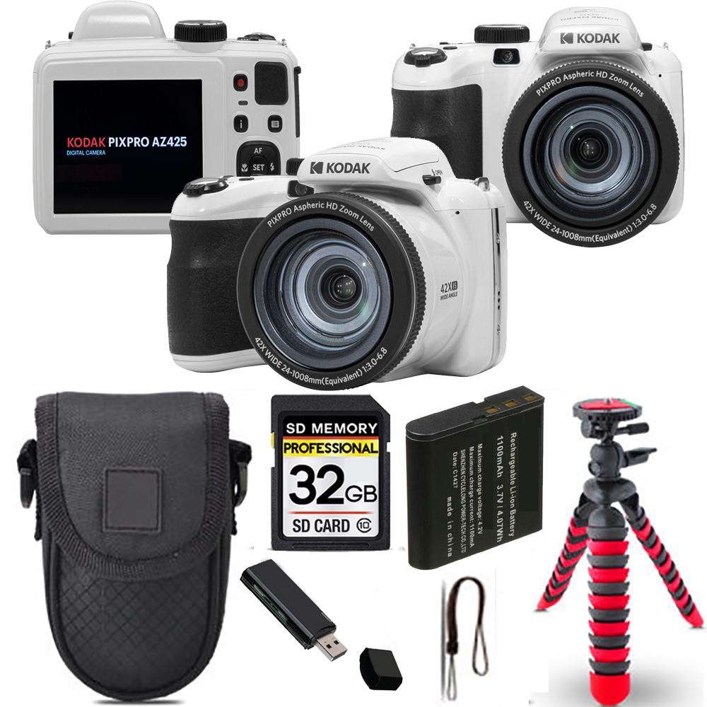 Kodak PIXPRO AZ425 Digital Camera (White) + Spider Tripod + Case - 32GB Kit