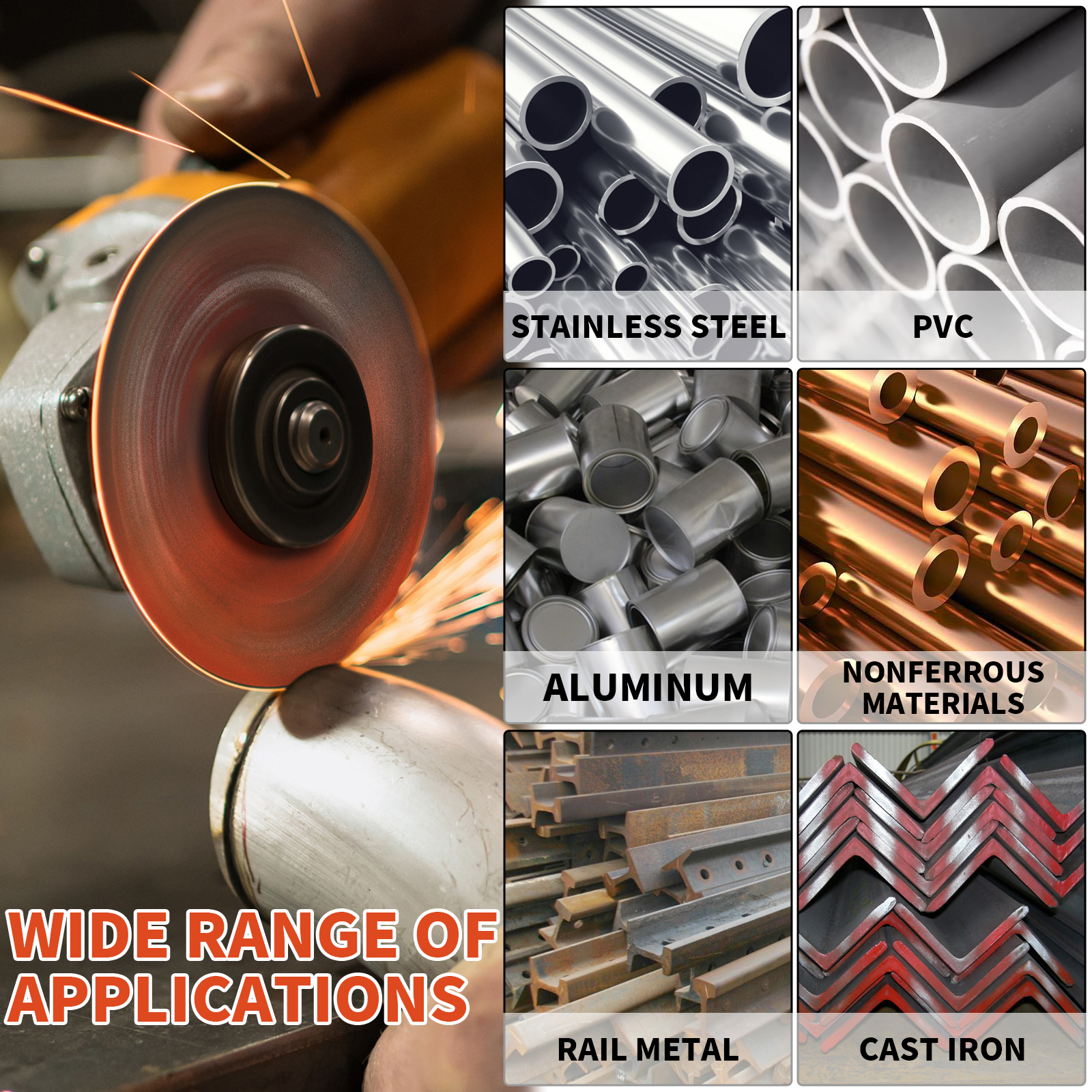 The angle grinder cut off wheels has strong aggressiveness for super-fast burr free cutting on metal, iron, steel, stainless steel, fiberglass, aluminum and plastic, including steel pipe, structural steel rebar, galvanized steel, sheet metal, structural tubing, other ferrous metals and non-ferrous metal,PVC.
