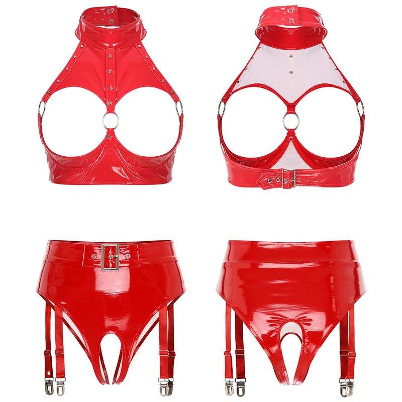 Matching high-waist and open crotch underwear, garter with clips for holding stockings to prevent slip off.
