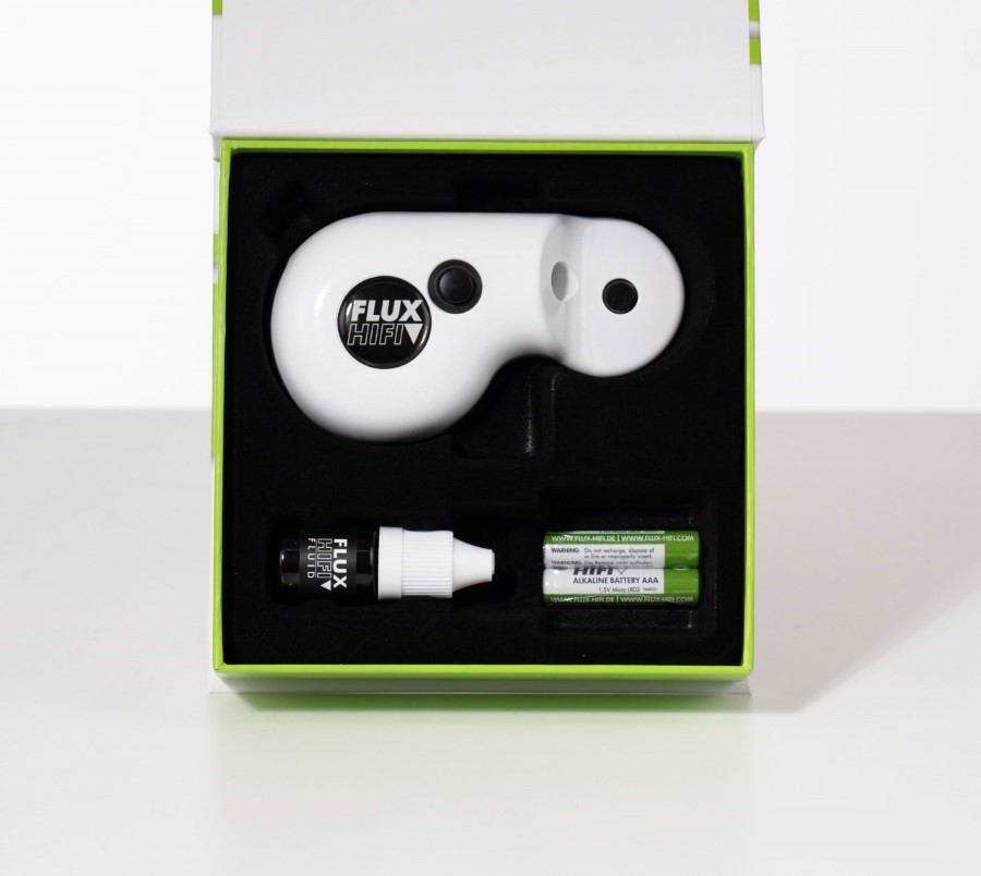 The operating principle is similar to an ultrasonic cleaner used in dental technology or an ultrasonic bath for eyeglasses. The surface is cleaned using strong high-frequency vibration. The treatment with ultrasound causes damage in some materials, such as aluminum. Even if the diamond would be perfectly cleaned, the adhesive joints and the suspension of the needle carrier would be harmed, same as with the application of aggressive cleaning liquids. The Flux-Sonic vibration cleaner, however, operates at a low frequency. The circuitry and mechanics are designed so that a three-dimensional vibration acts on the needle, ensuring that all dirt particles are removed. The frequency is exactly tuned so that damage to the bonding or the suspension is ruled out - the cleaning result, however, is perfect. The deflections are far from the values of the actual scanning. The motion of the needle corresponds only to a fraction of the load during the playback process. A fluid is needed to transmit vibrations from the device to the needle. This fluid, prepared on the basis of isopropanol, ensures an additional, gentle cleansing effect. After its application, it evaporates without leaving a residue. Flux-Fluid is applied on a specially designed pad made of the finest PE fibers. Due to their number and the resulting density, these fibers already produce a capillary effect, which is very similar to the effect of a liquid. In conjunction with Flux-Fluid, we get a perfect combination that transmits the vibration and, at the same time, absorbs the dirt. We recommend using it every time before playing a record.
