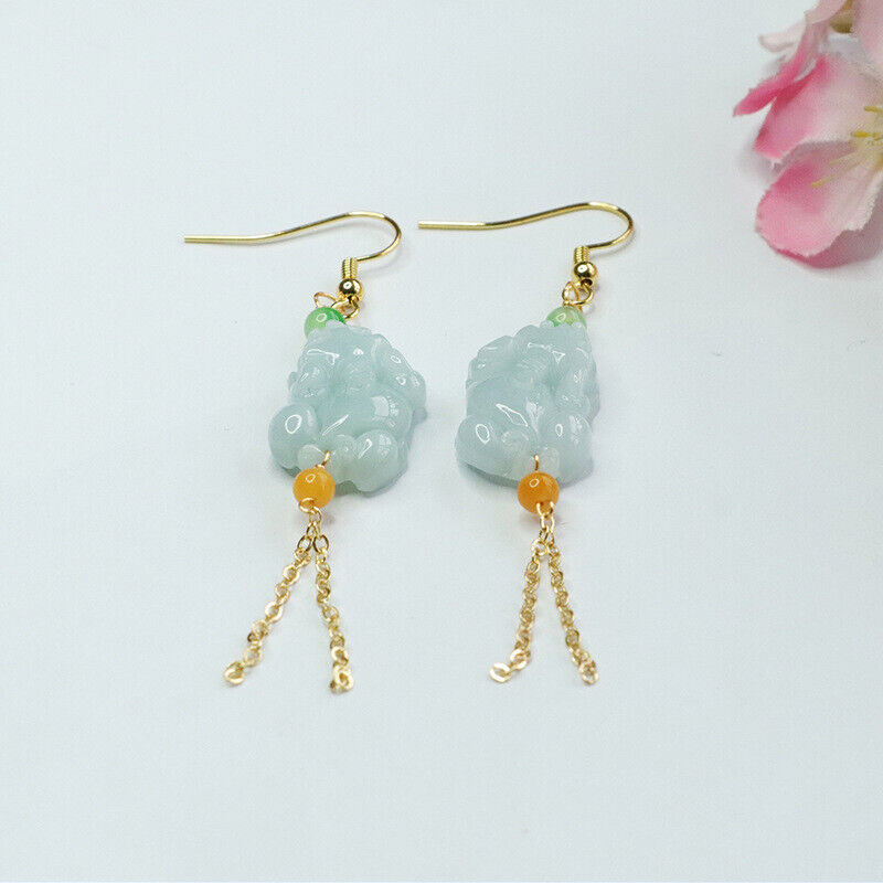Burmese Jade Pixiu Earrings Jewelry Women 925 Silver Natural White Jadeite