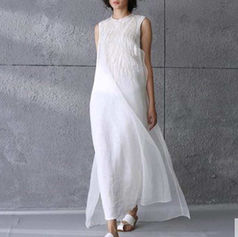 Women's Summer Sleeveless Maxi Linen Cotton Loose White Dress Long Dress