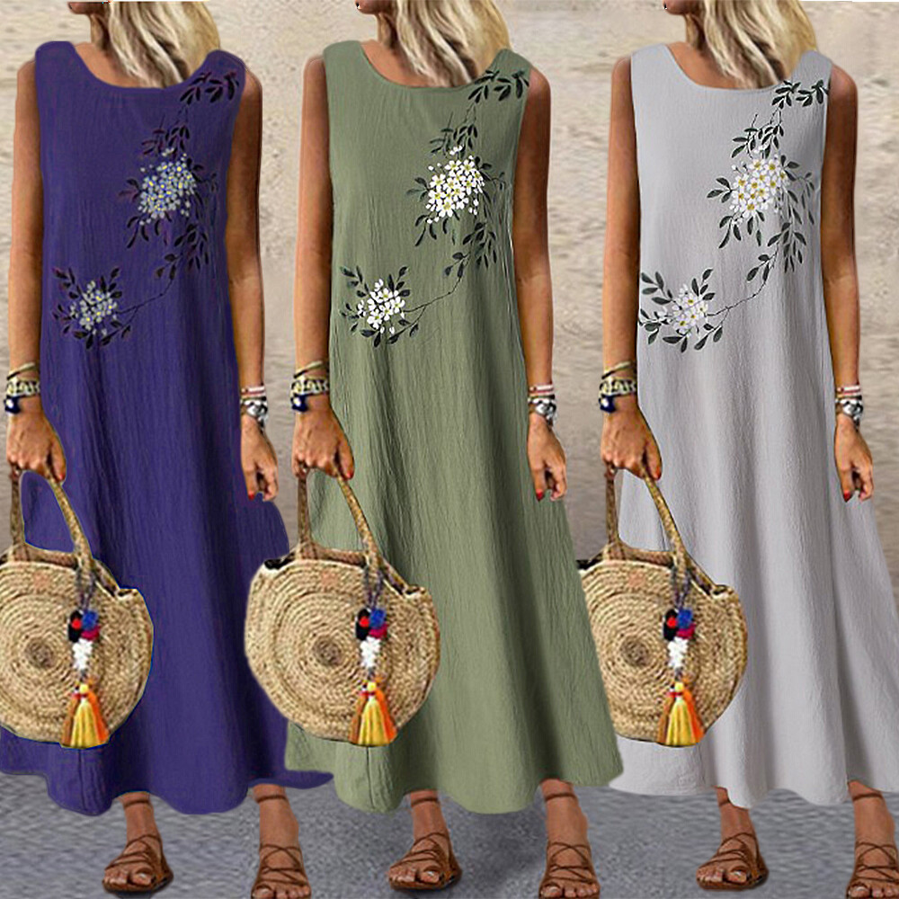 Summer Ladies Plus Size Women's Casual Loose Boho Floral Cotton Linen Maxi Dress