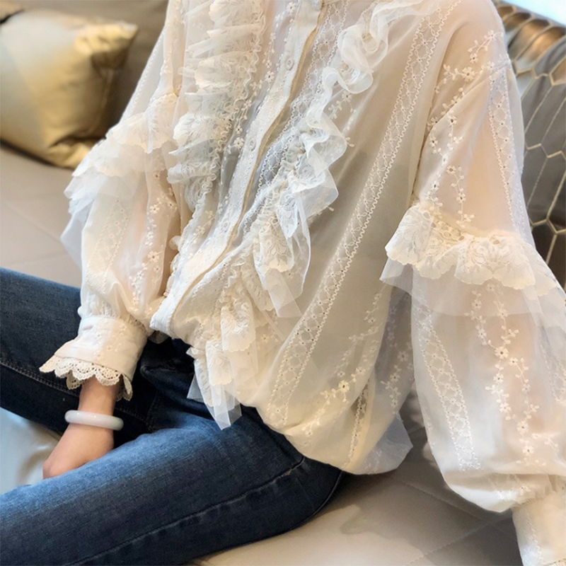 Lady Puff Sleeve Stand-Up Collar Blouse Embroidered Long Lace Ruffled Shirt Tops