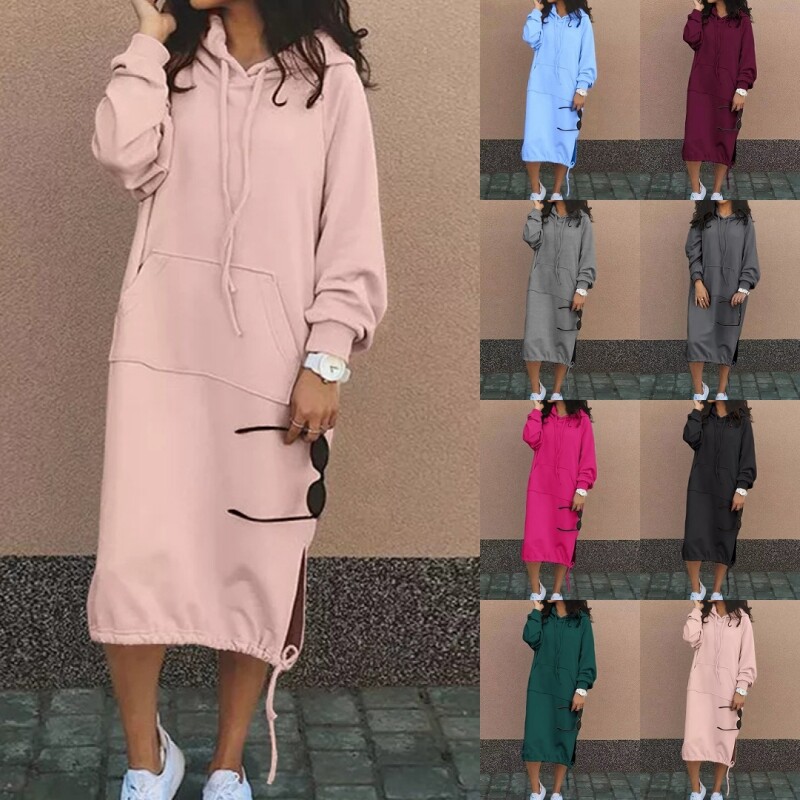 Women Hooded Dresses Drawstring Sweatshirt Dress Ladies Fall Loose Long Sleeve