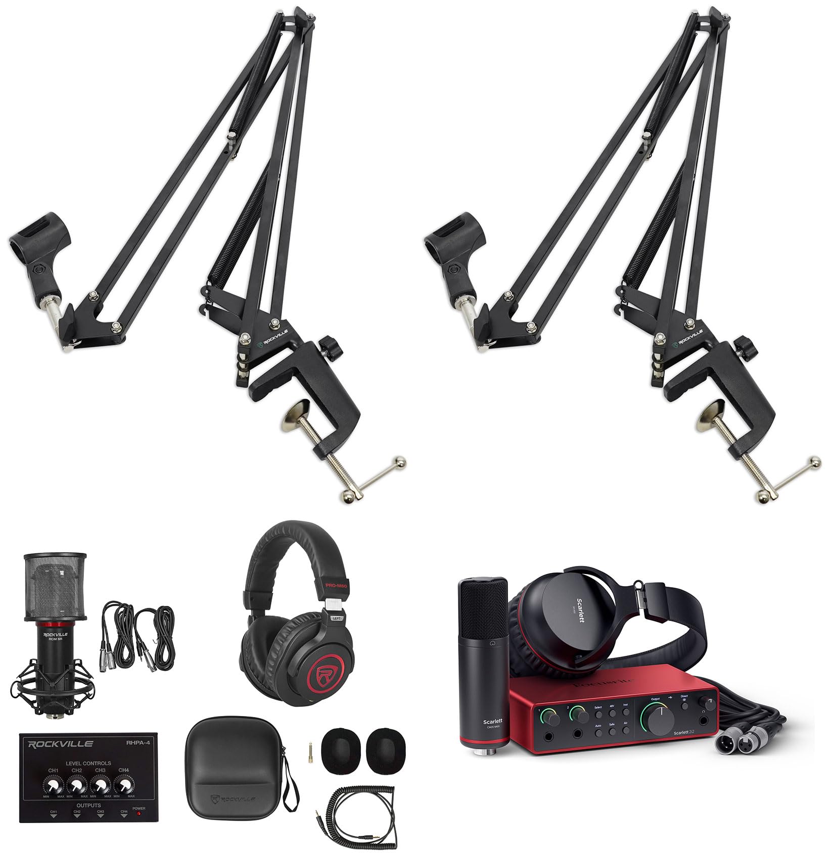 Package Includes: (1) Focusrite Scarlett 2i2 Studio 4th Gen Recording Interface+Headphones+Mic+Cable+(1) Rockville RCM SR Studio/Recording Condenser Microphone Mic w/ Samsung Capacitors+(1) Rockville PRO-M50 SR Studio Headphones+Detachable Coil Cable+Case+Extra Ear Pad+(1) Rockville RHPA4 4 Channel Professional Headphone Amplifier Stereo or Mono Amp+(2) Rockville DMS40 40" Microphone Boom Arm Studio Podcast USB Mic Stand+Desk Clamp