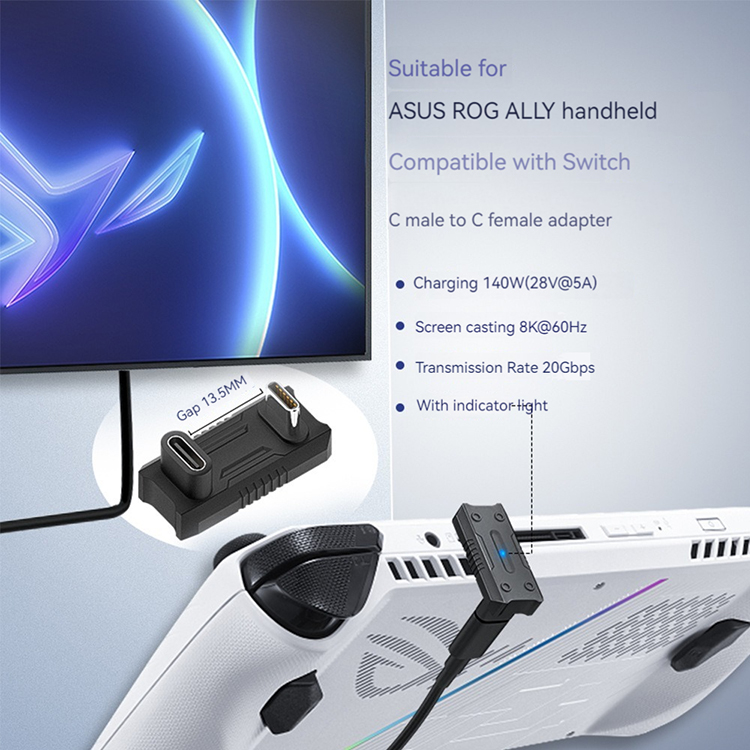Features: l 140W fasting charging, with PD3.1 fast charging cable, fast full charge in fragmented time l 8K high definition image quality, more realistic and smooth l Transmission rates up to 20Gbps, charging and transferring are both fast l Suitable for ASUS ROG Ally handheld game console, compatible with Switch l High quality for professional use Specification: l Material: PVC l Color: Black l Size: 14.5x13.5x28mm l Adaptor Interface: Type-C Male to Female l Applicable Model: for ASUS ROG Ally Handheld Game Console/Switch l Quantity: 1 PCS Package: l 1x Expansion Adaptor Note: l Only the above package content, does not include other accessories