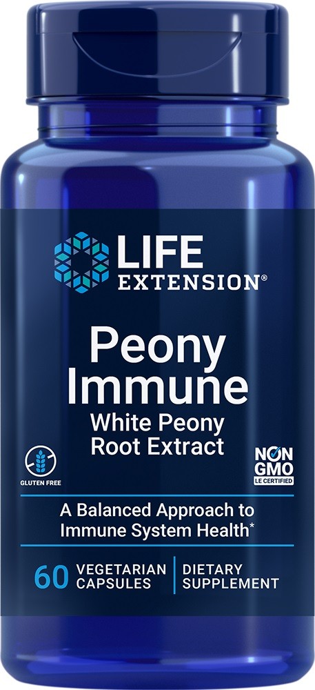 Peony Immune von Life Extension ist ein Nahrungsergänzungsmittel in vegetarischen Kapseln, die weißen Pfingstrosenwurzel-Extrakt enthalten.