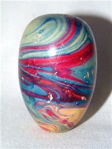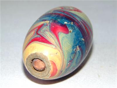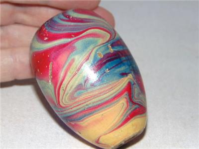 Colorful and fun vintage solid wood end of day darning sewing tool measuring 2-1/2" in size. Featuring an oval egg, it bears the original paint in vibrant marbleized swirls.