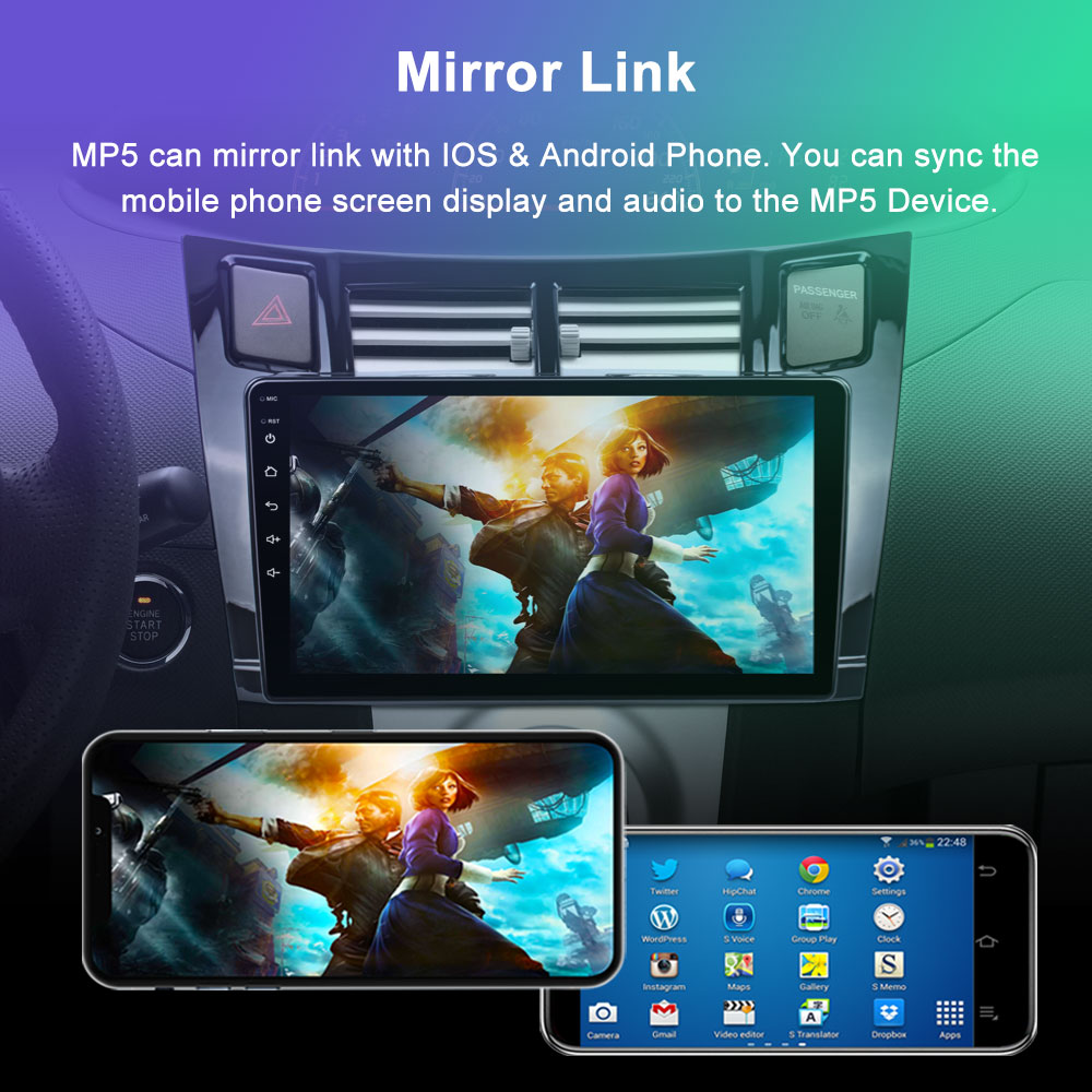 6.Mirror link function:Android player can mirror link with Android phone by USB cable ,IOS phone link by WIFI (Not fit for All phone)