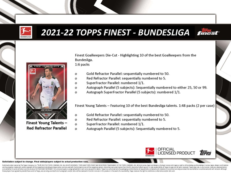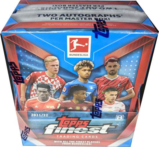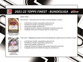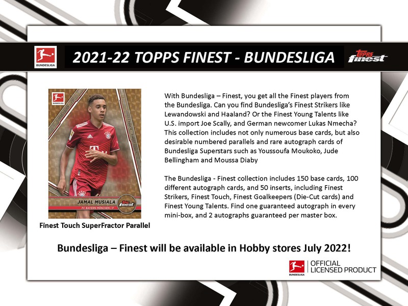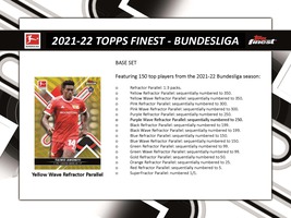 2021-22 Topps Finest Bundesliga Soccer Cards delivers (2) Autographed Cards plus (4) Refractors and (7) Inserts in Every Box! Look for Bundesliga’s Finest Strikers like Lewandowski and Haaland, plus the Finest Young Talents like U.S. import Joe Scally, and German newcomer Lukas Nmecha. This collection includes not only numerous base cards, but also desirable numbered parallels and RARE autograph cards of Bundesliga Superstars such as Youssoufa Moukoko, Jude Bellingham and Moussa Diaby.