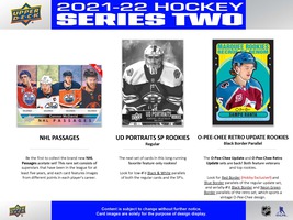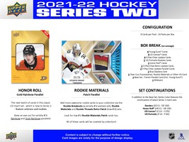 2021-22 Upper Deck NHL Series Two Hockey Cards* delivers (6) Young Guns Rookie Cards, (6) Inserts, (4) UD Canvas Cards, (2) UD Portraits, (2) Honor Roll, (8) OPC Update Cards and (1) Dazzlers Blue Card plus (1) Clear Cut, Fluorescence Red, Rookie Materials or Other Hit Card, (1) Base Set – French Parallel Card (incl. Young Guns) and (1) Wildcard in Every Box!