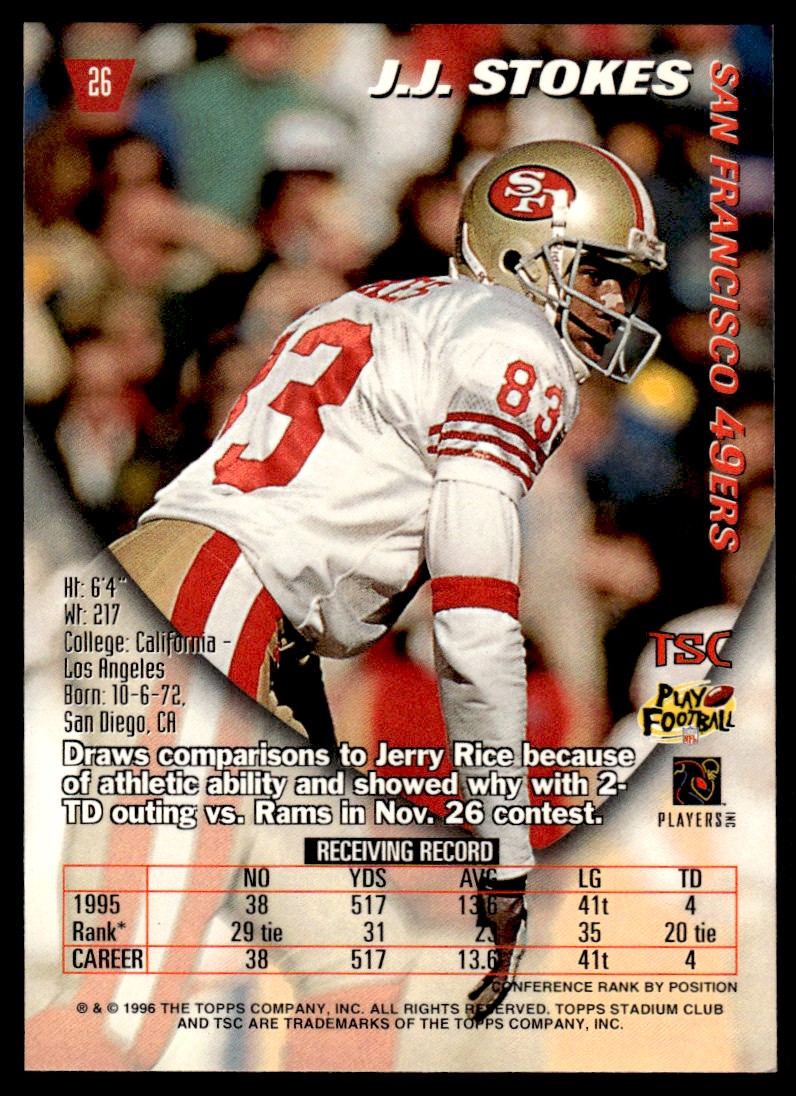 | Description: | Jerry Rice | | Category: | Football | | Year: | 1996 | | Product: | Stadium Club Football Card | | Team: | San Francisco 49ers | | Card Number: | 26 | | Dimensions: | 3½" x 2½" |