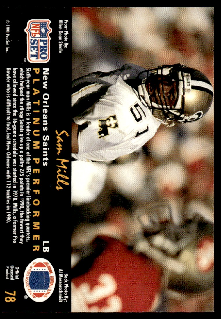 | Description: | Sam Mills | | Category: | Football | | Year: | 1991 | | Product: | Pro Set Platinum Football Card | | Team: | New Orleans Saints | | Card Number: | 78 | | Dimensions: | 3½" x 2½" |