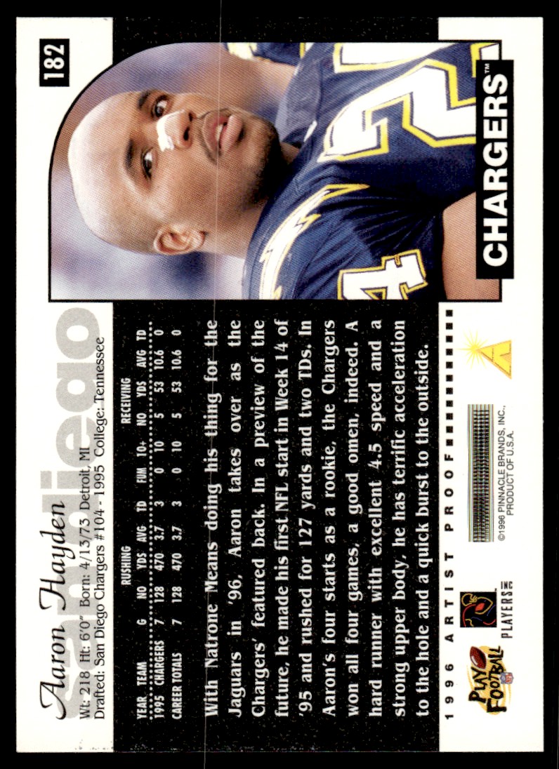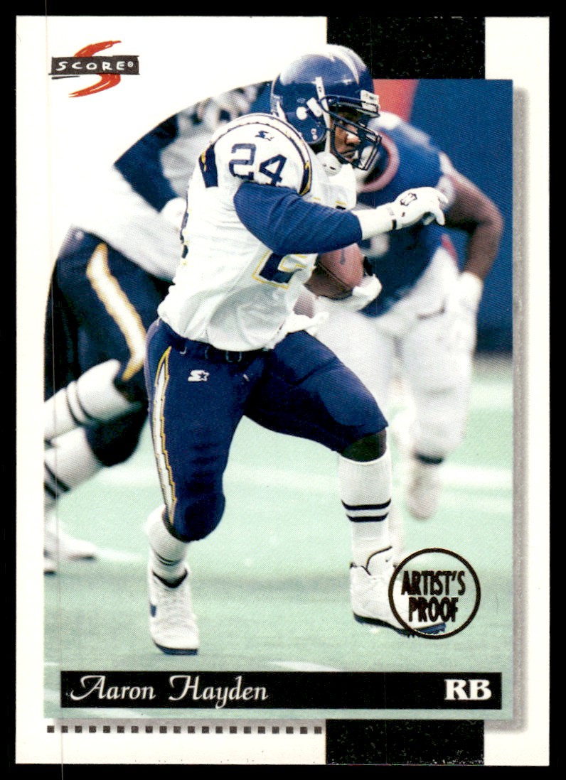 | Description: | Aaron Hayden | | Category: | Football | | Year: | 1996 | | Product: | Score Football Card | | Team: | San Diego Chargers | | Card Number: | 182 | | Dimensions: | 3½" x 2½" |