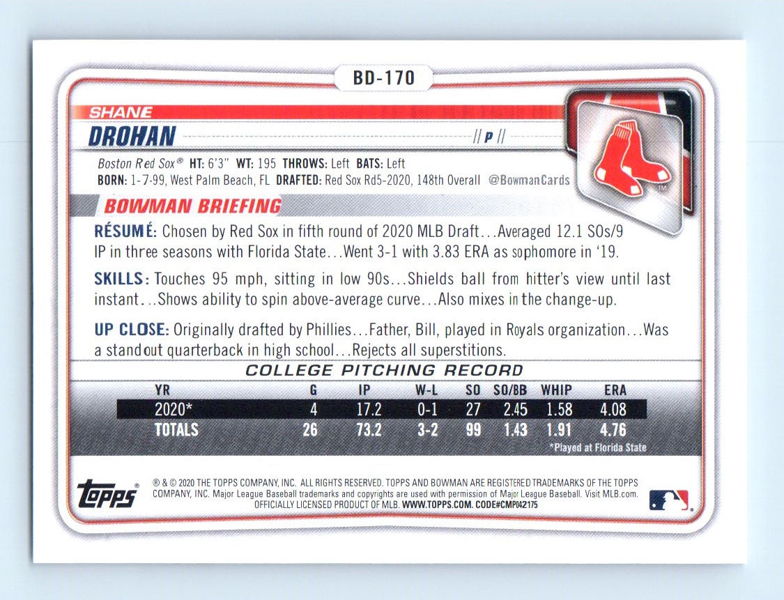 | 2020 Bowman Draft Shane Drohan Boston Red Sox #BD-170 |