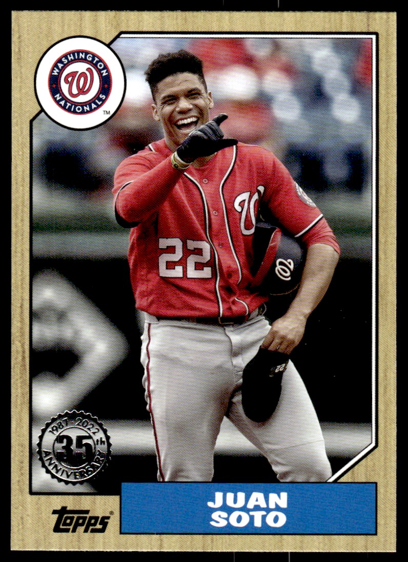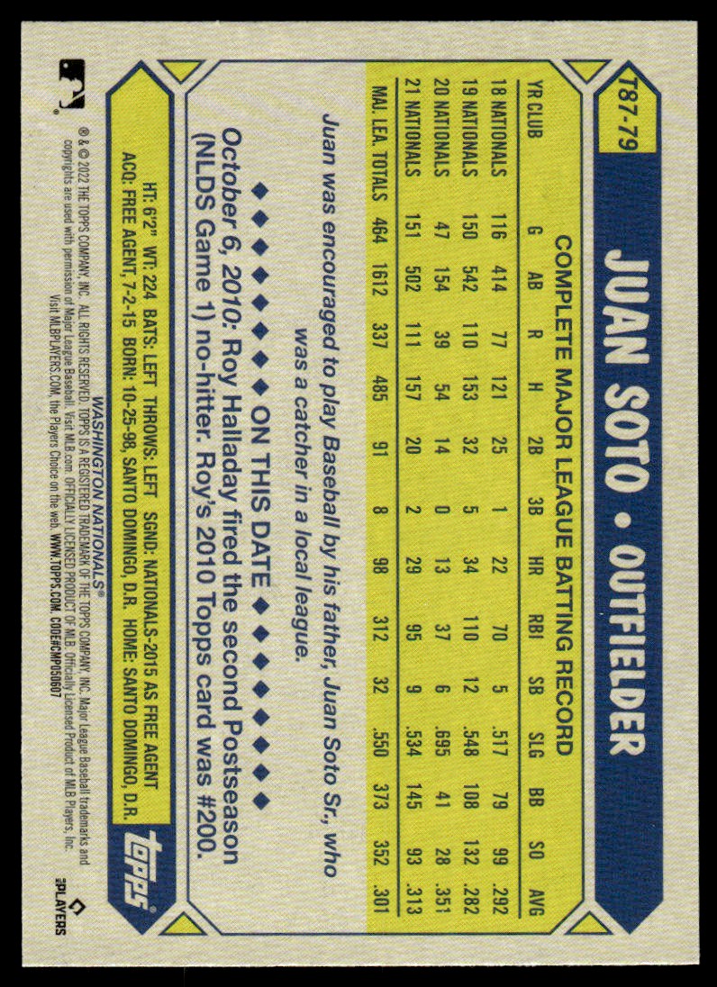 | Description: | Juan Soto | | Category: | Baseball | | Year: | 2022 | | Product: | Topps Baseball Card | | Team: | Washington Nationals | | Card Number: | T87-79 | | Dimensions: | 3½" x 2½" |