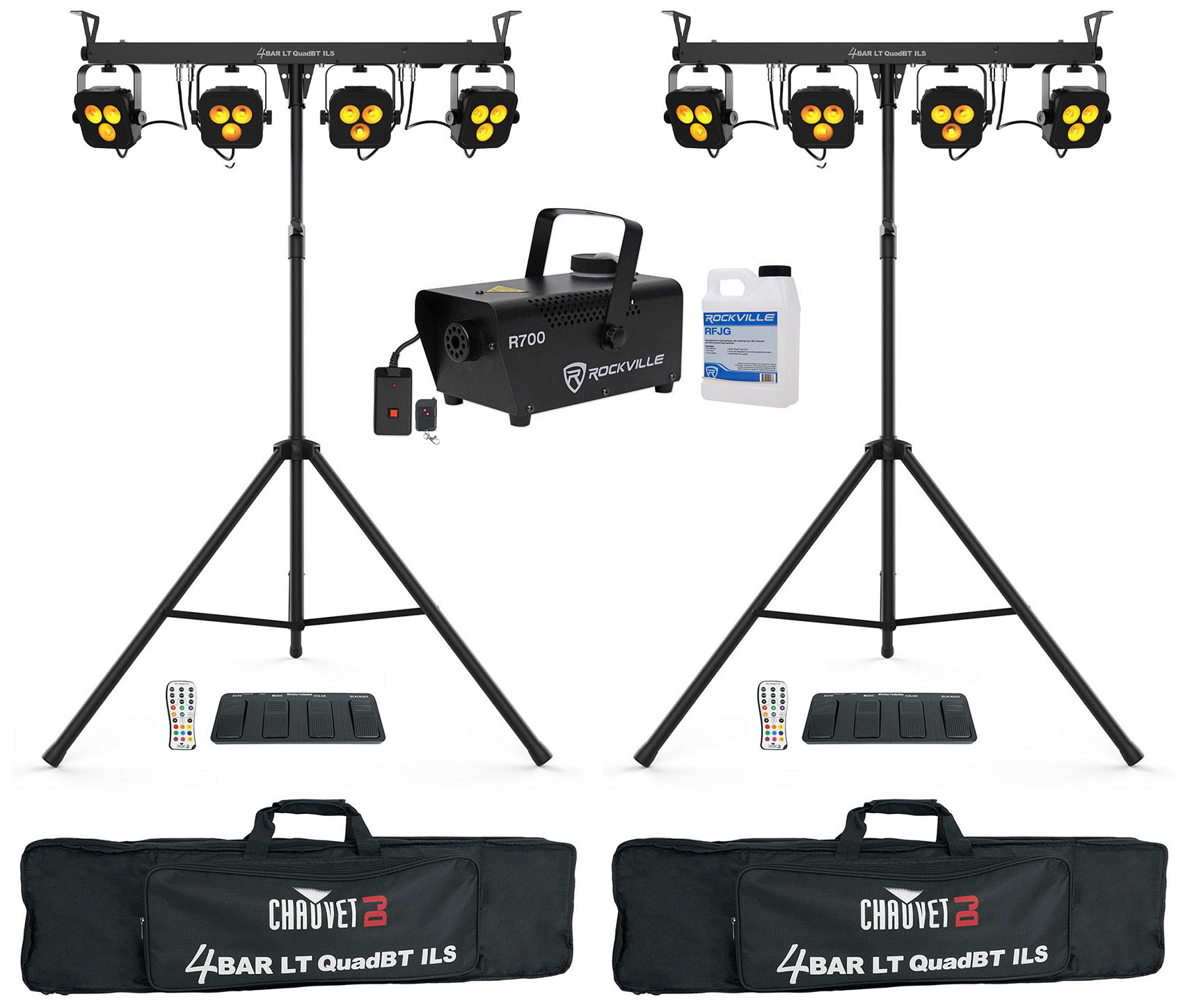 2 Chauvet DJ 4BAR LT QuadBT ILS Bluetooth Light Kits+Tripods+Footswitches+Fogger