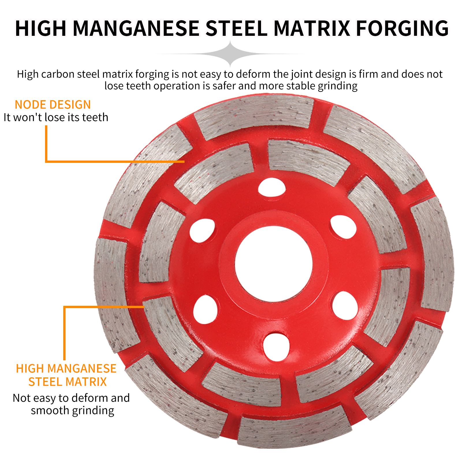The diamond wheel is forged with high manganese steel as the matrix, which is not easy to deform, the blade is welded firmly, the operation is safer, and the grinding is more stable.