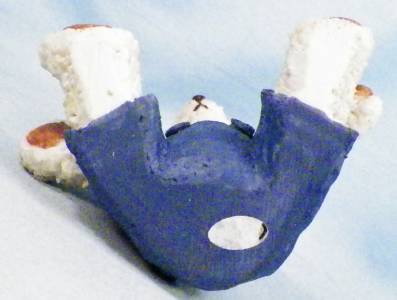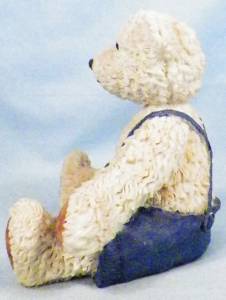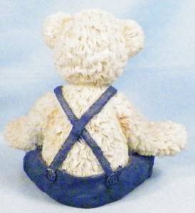 - Off white "fur" with blue overalls. Made of resin or acrylic. 4 1/2" wide x 3 1/4" deep x 4" tall