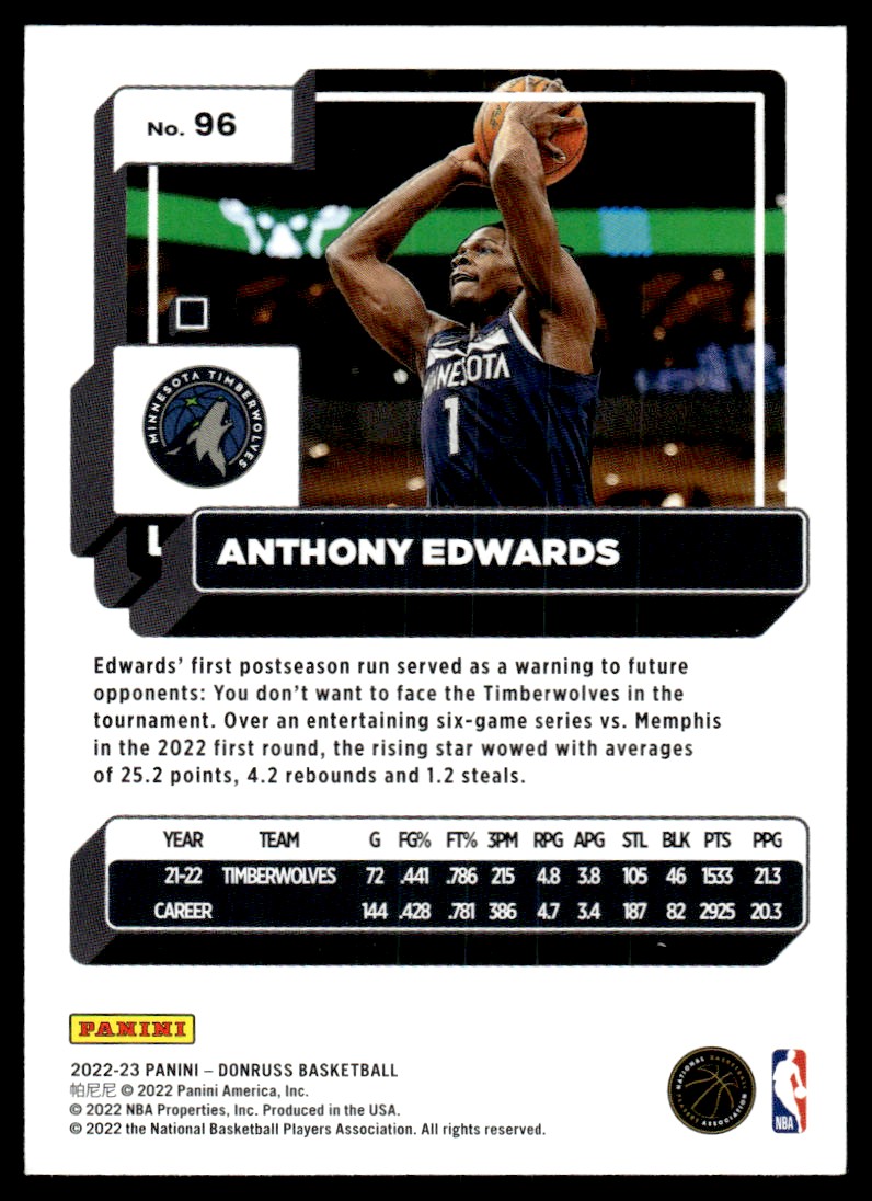 | 2022-23 Donruss Basketball 96 Anthony Edwards |