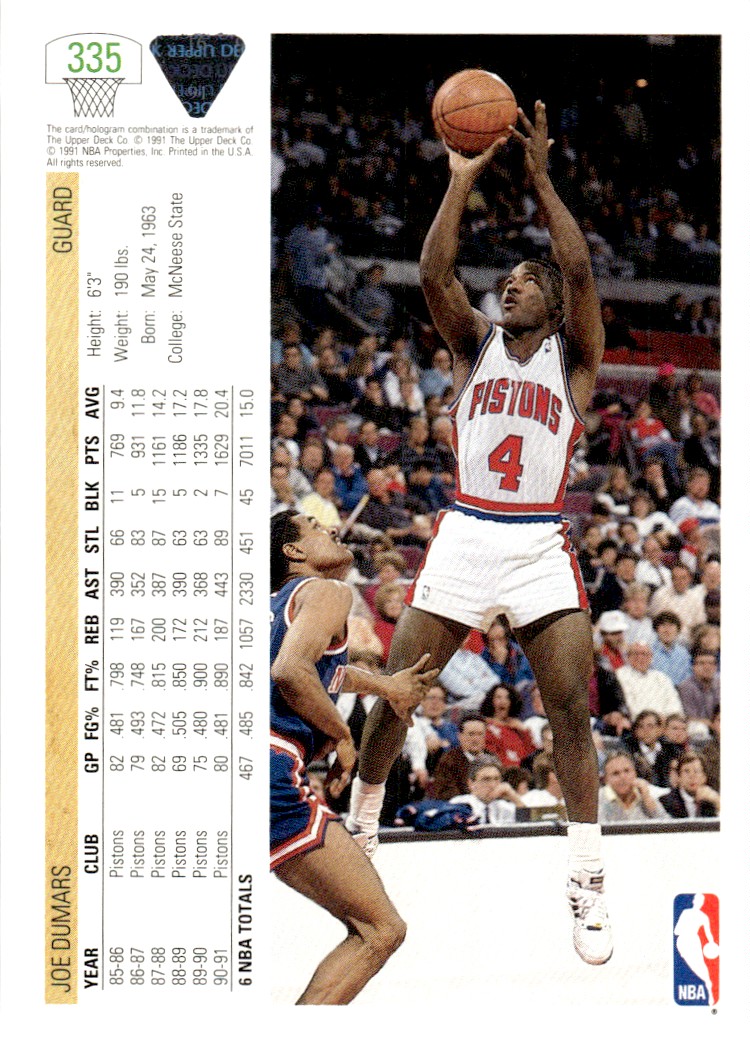 | Description: | Joe Dumars | | Category: | Basketball | | Year: | 1991 | | Product: | Upper Deck Basketball Card | | Team: | Detroit Pistons | | Card Number: | 335 | | Dimensions: | 3½" x 2½" |