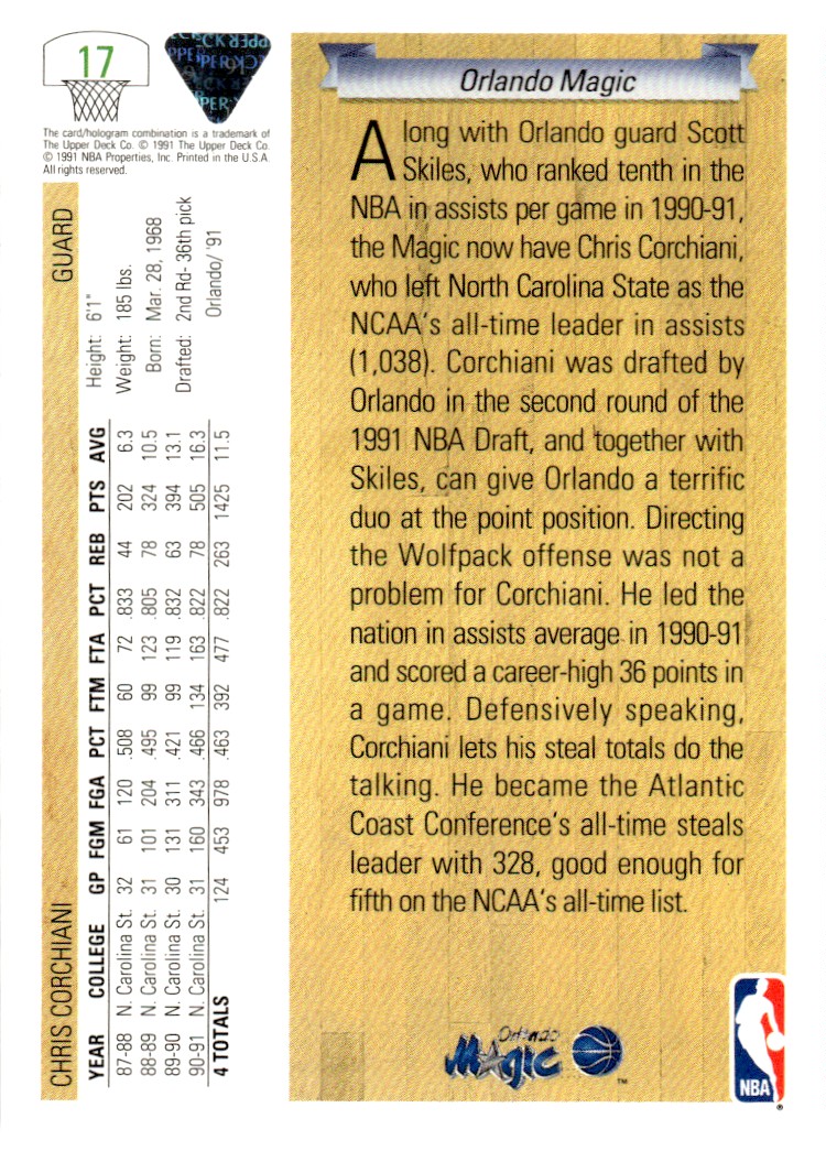 | Description: | Chris Corchiani | | Category: | Basketball | | Year: | 1991 | | Product: | Upper Deck Basketball Card | | Team: | Orlando Magic | | Card Number: | 17 | | Dimensions: | 3½" x 2½" |