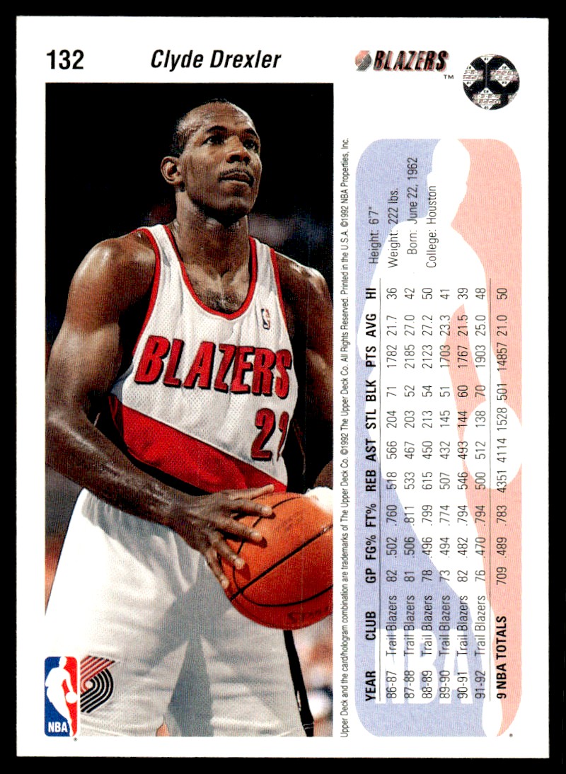 | Description: | Clyde Drexler | | Category: | Basketball | | Year: | 1992 | | Product: | Upper Deck Basketball Card | | Team: | Portland Trail Blazers | | Card Number: | 132 | | Dimensions: | 3½" x 2½" |