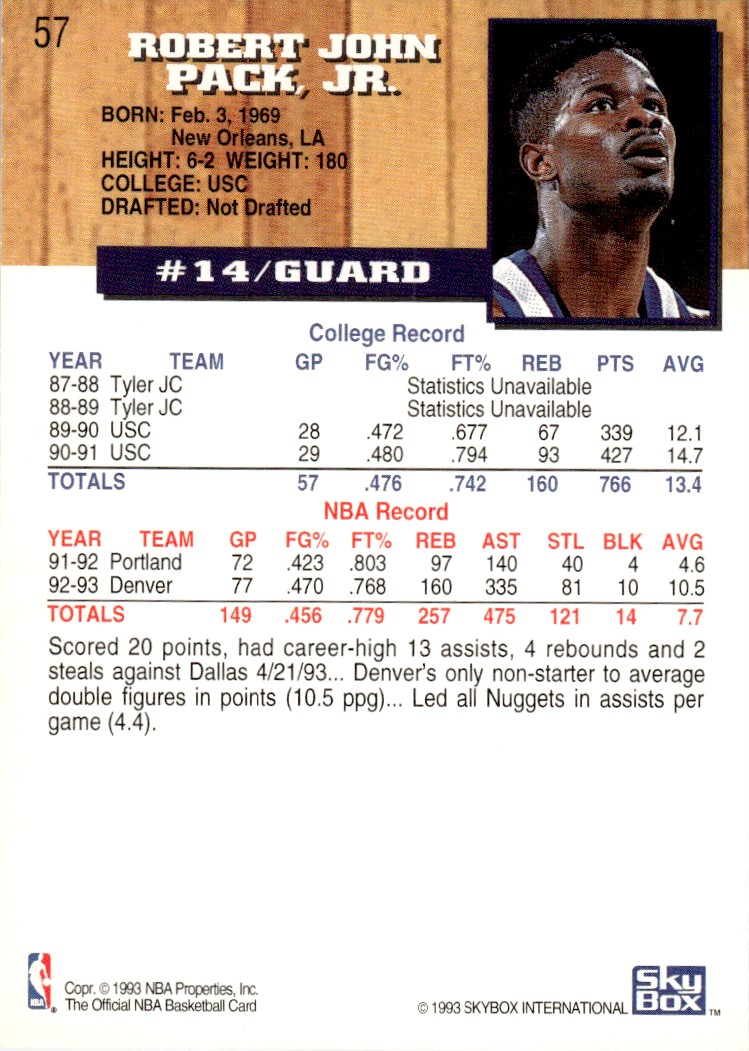 | Description: | Robert Pack | | Category: | Basketball | | Year: | 1993 | | Product: | NBA Hoops Basketball Card | | Team: | Denver Nuggets | | Card Number: | 57 | | Dimensions: | 3½" x 2½" |