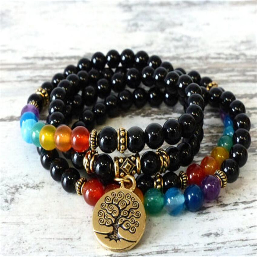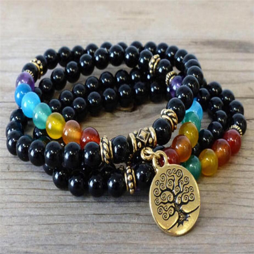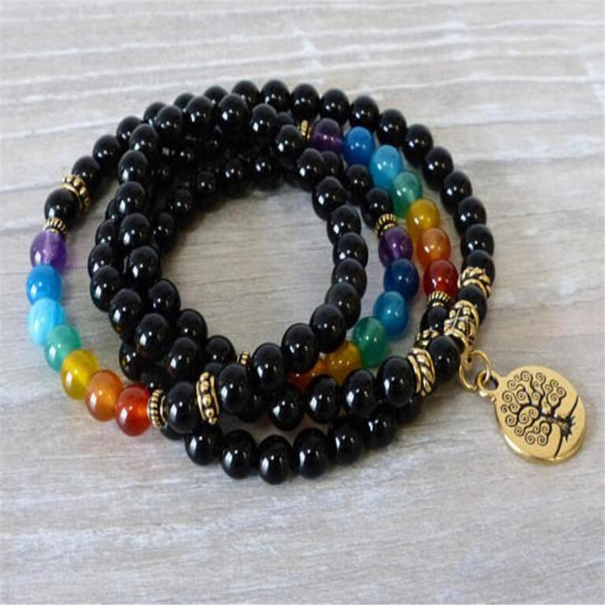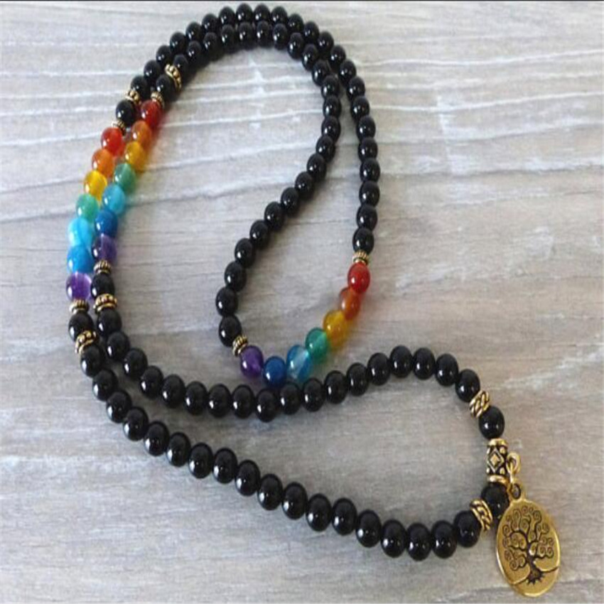 6mm Black agate 7 color Gemstone Mala Necklace 108 Bead Buddhism Unisex Bless