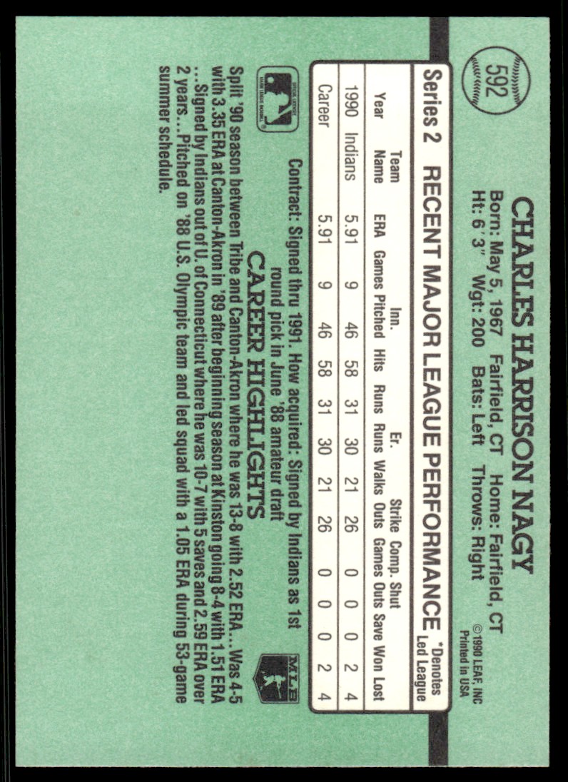 | Description: | Charles Nagy | | Category: | Baseball | | Year: | 1991 | | Product: | Donruss Baseball Card | | Team: | Cleveland Indians | | Card Number: | 592 | | Dimensions: | 3½" x 2½" |