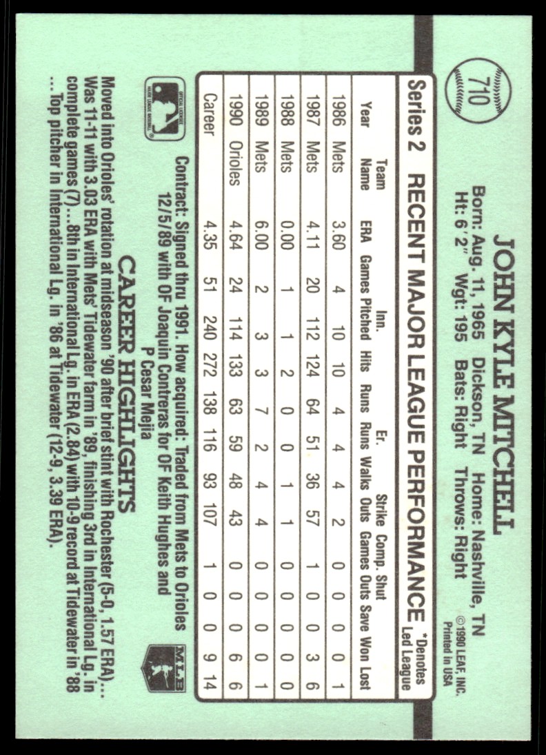 | Description: | John Mitchell | | Category: | Baseball | | Year: | 1991 | | Product: | Donruss Baseball Card | | Team: | Baltimore Orioles | | Card Number: | 710 | | Dimensions: | 3½" x 2½" |