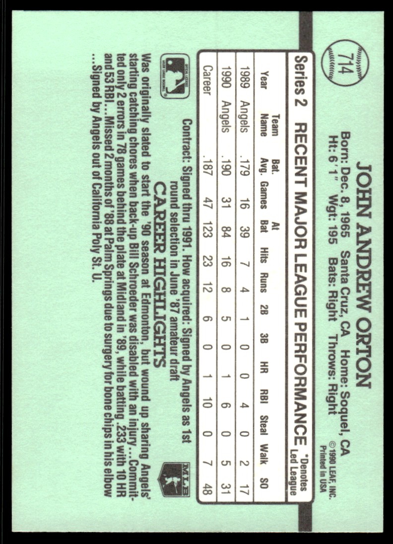 | Description: | John Orton | | Category: | Baseball | | Year: | 1991 | | Product: | Donruss Baseball Card | | Team: | California Angels | | Card Number: | 714 | | Dimensions: | 3½" x 2½" |