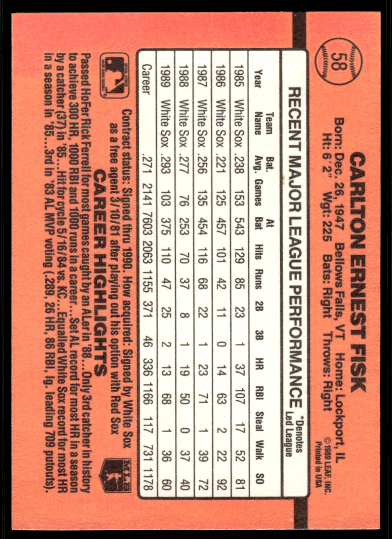 | Description: | Carlton Fisk | | Category: | Baseball | | Year: | 1990 | | Product: | Donruss | | Team: | Chicago White Sox | | Card Number: | 58 | | Dimensions: | 3½" x 2½" |